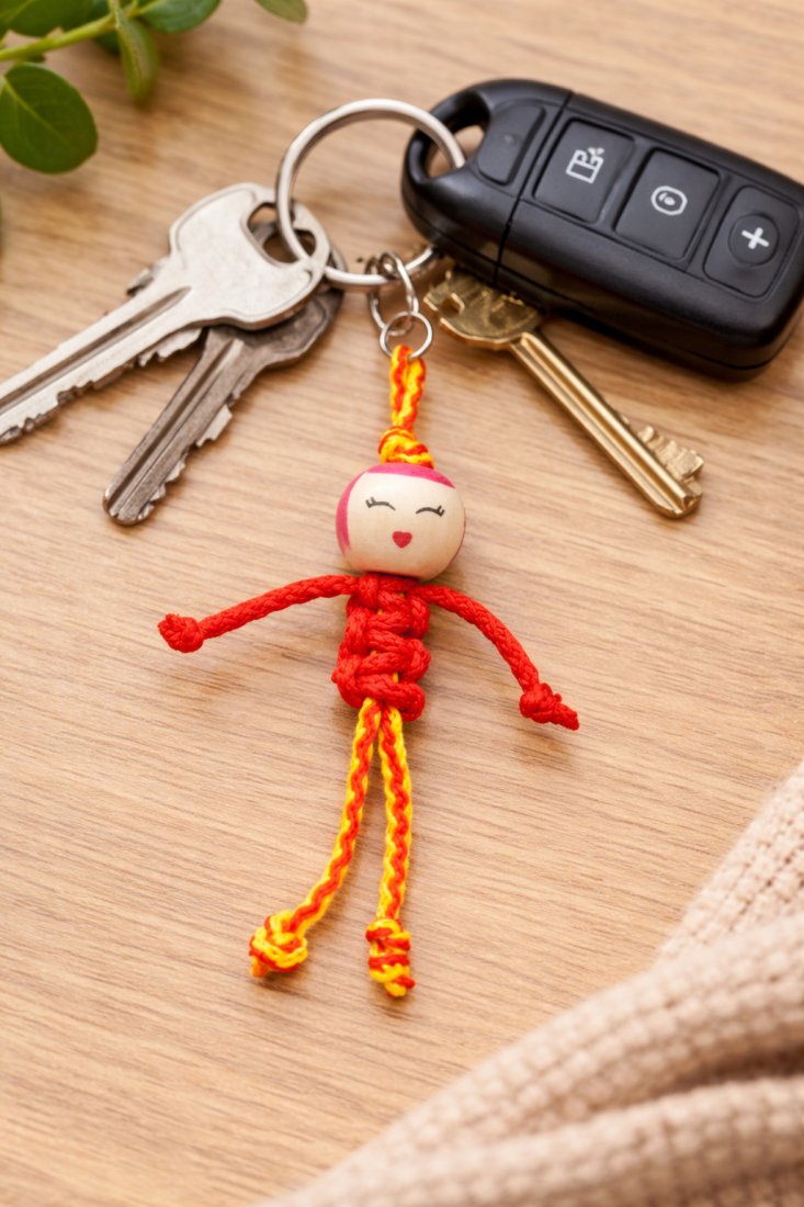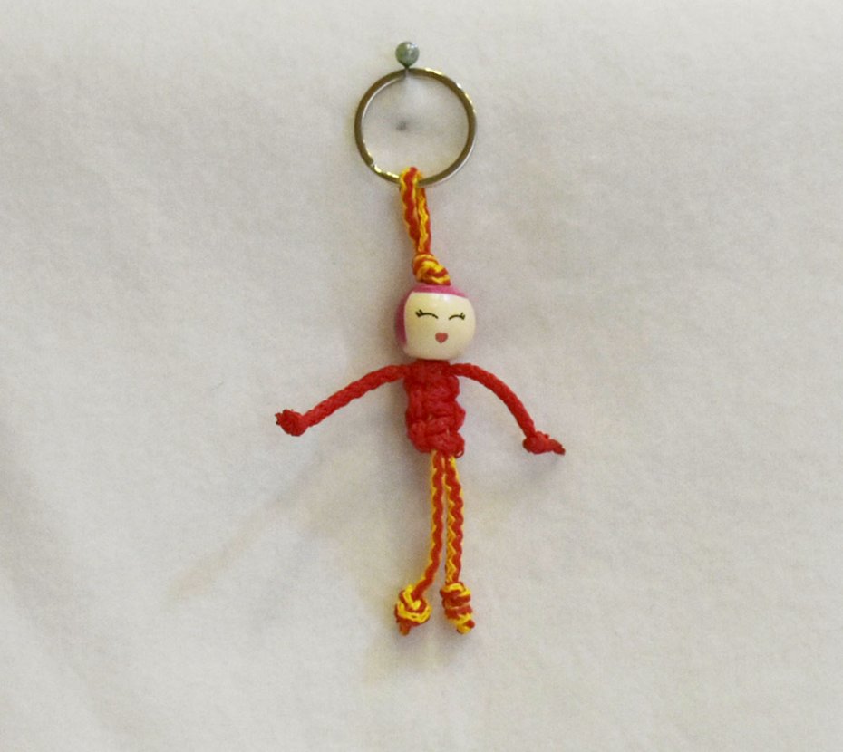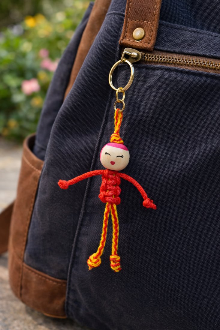 Ten ręcznie wykonany breloczek to połączenie prostoty, koloru i radosnej energii. Pleciony z czerwono-żółtych sznurków, z uroczą buźką, pięknie ożywi każdą torbę, plecak czy pęk kluczy.