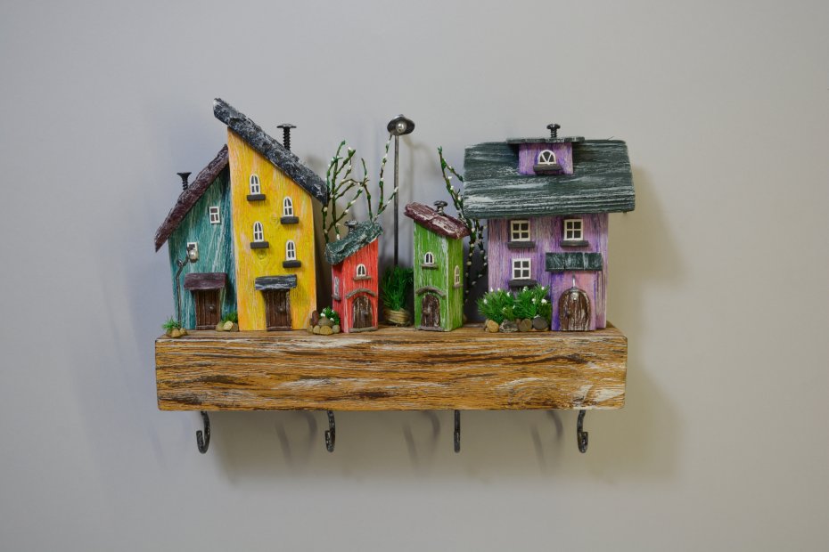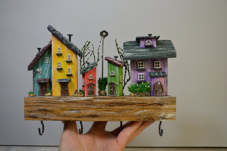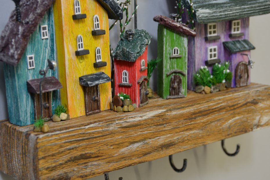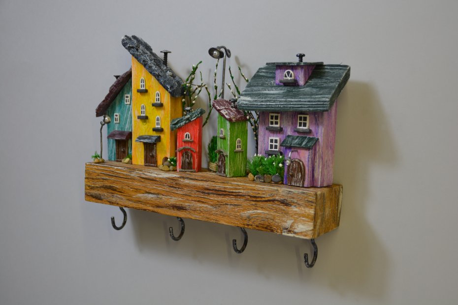 Ten drewniany wieszak na klucze wykonany jest z drewna sosnowego. Małe drewniane domki ze starego drewna oraz śrub, gwoździ, podkładek do śrub i nie tylko. Domy są ręcznie malowane ekologicznymi farbami na bazie wody. Wszystkie materiały, których używam są ekologiczne, pochodzą z napraw i recyklingu. Daję drugie życie starym, zapomnianym materiałom.