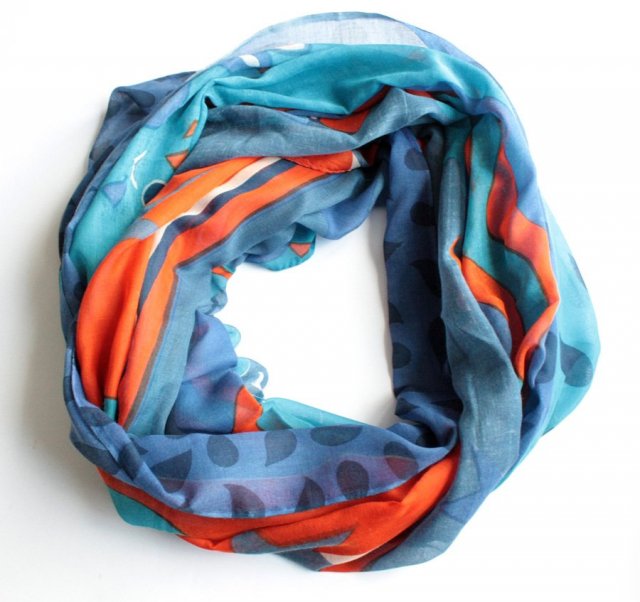Duży, wielobarwny szal z miękkiej, miłej w dotyku tkaniny (to prawdopodobnie bawełna lub wiskoza).