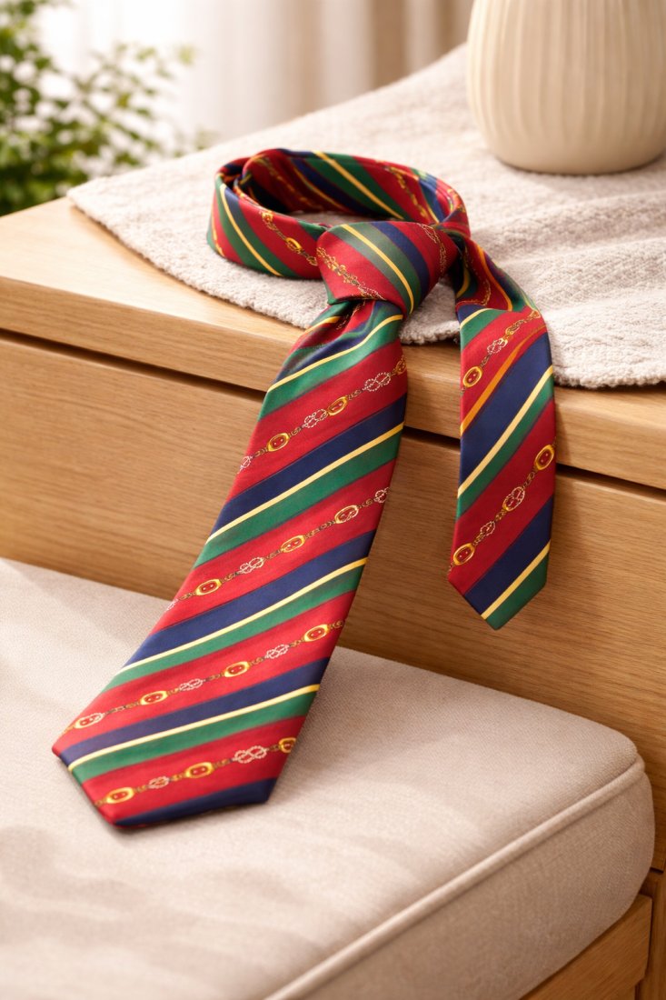 Elegancki krawat o wyrazistym, wielobarwnym wzorze, który przyciąga uwagę i nadaje stylizacji charakteru. Połączenie czerwieni, zieleni i granatu z delikatnym motywem dekoracyjnym tworzy ponadczasowy, klasyczny wygląd. Doskonale sprawdzi się zarówno w formalnych zestawach, jak i jako akcent przełamujący prosty strój. Idealny wybór dla osób ceniących styl i detale.