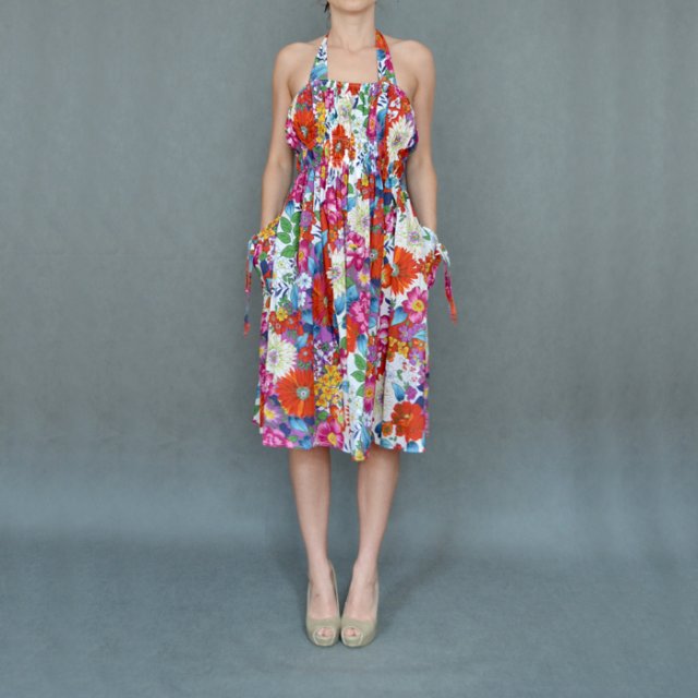 Sukienka z eksplozją kolorowych kwiatów. Wiązana na szyi. Biust mocno marszczony. Po bokach odstające kieszonki. Na podszewce.