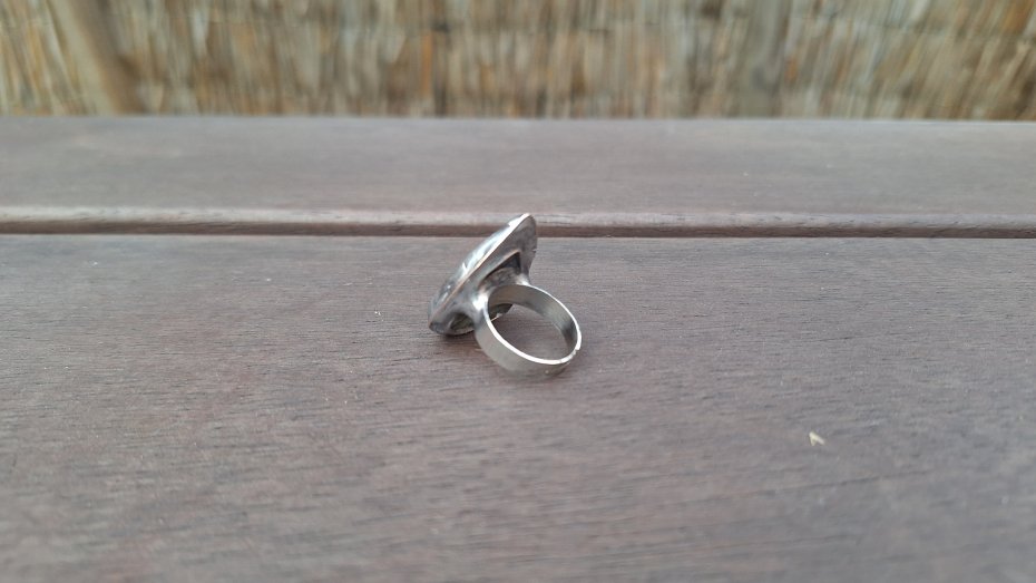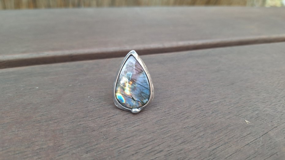 Pierścionek wykonany z miedzi, cyny i labradorytu. Wymiary ok. 2.8 na 2 cm. Regulowany. Nie jest ciężki.