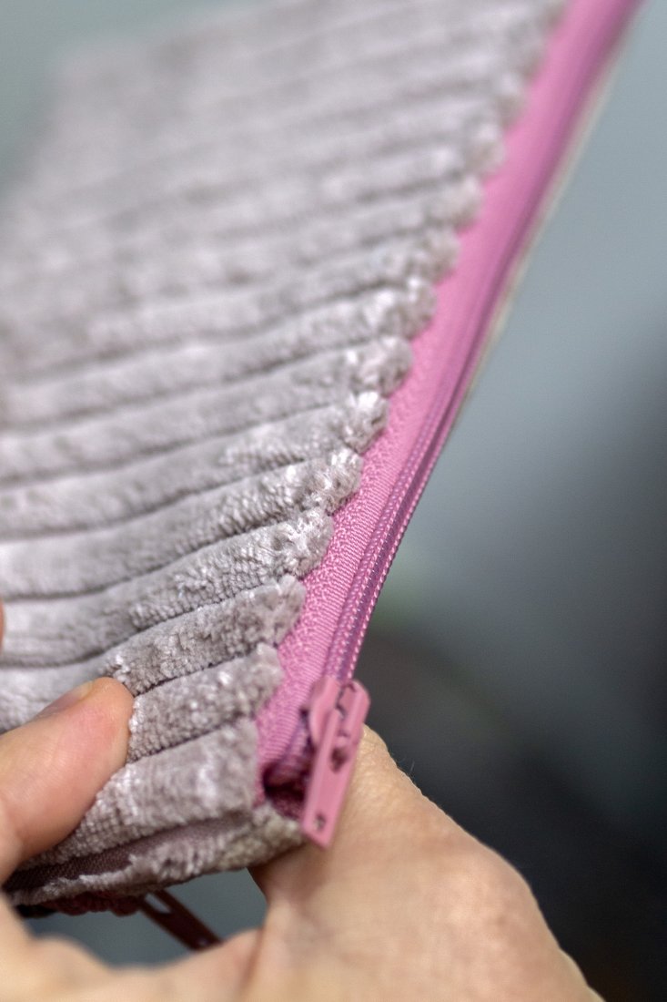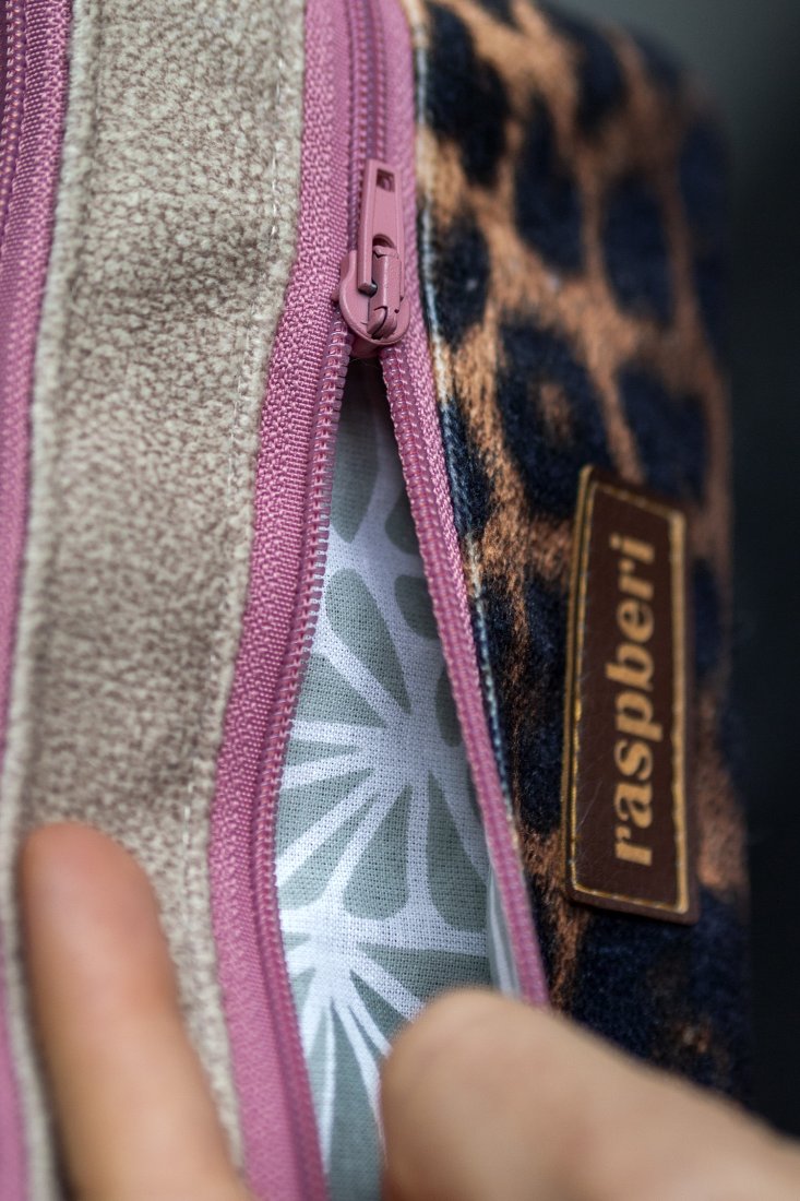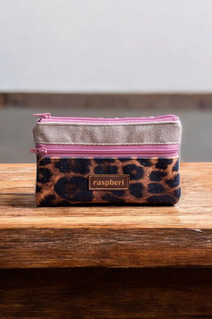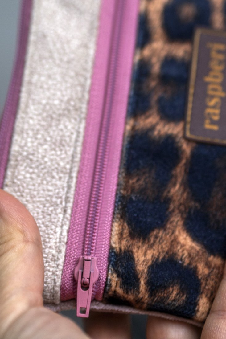 Prosty wodoodporny portfel wykonany z grubego pudroworóżowego sztruksu, beżowego weluru oraz weluru w panterkę.