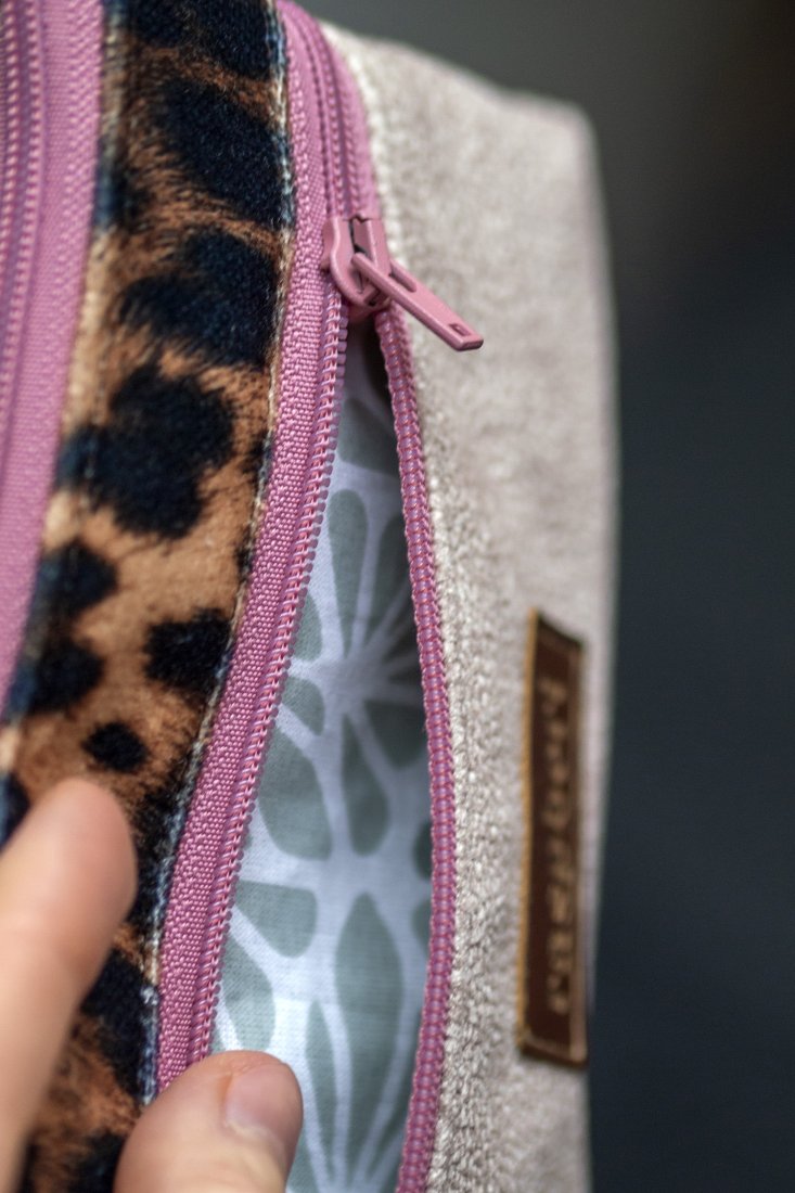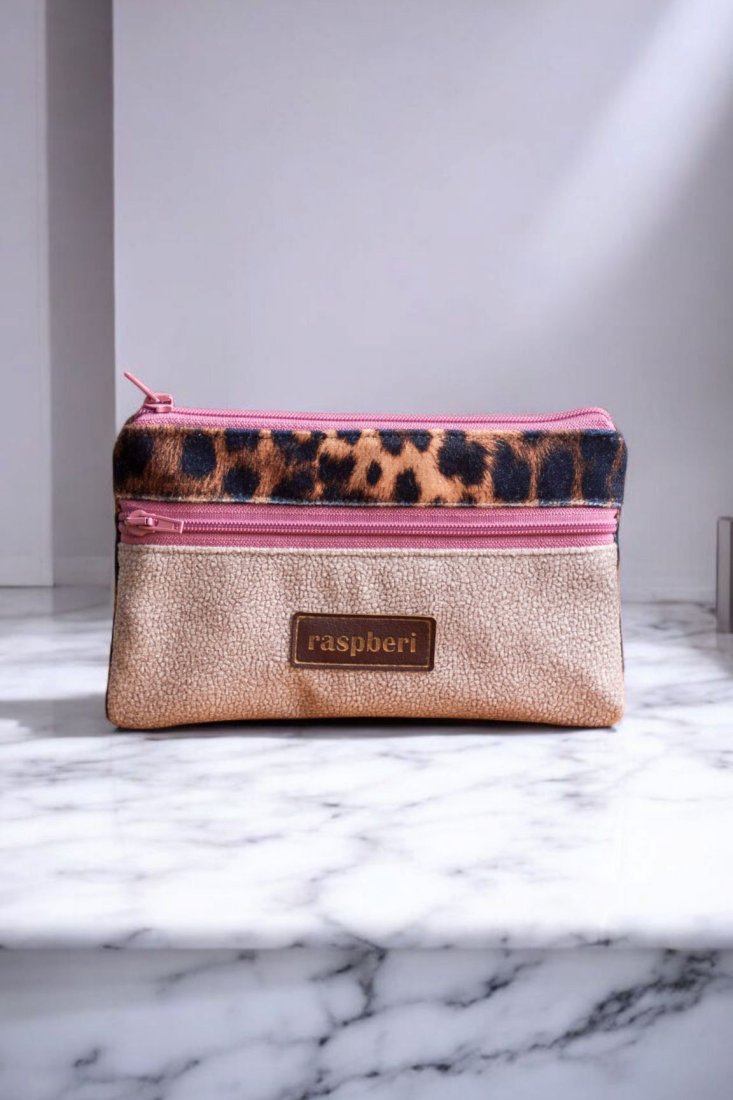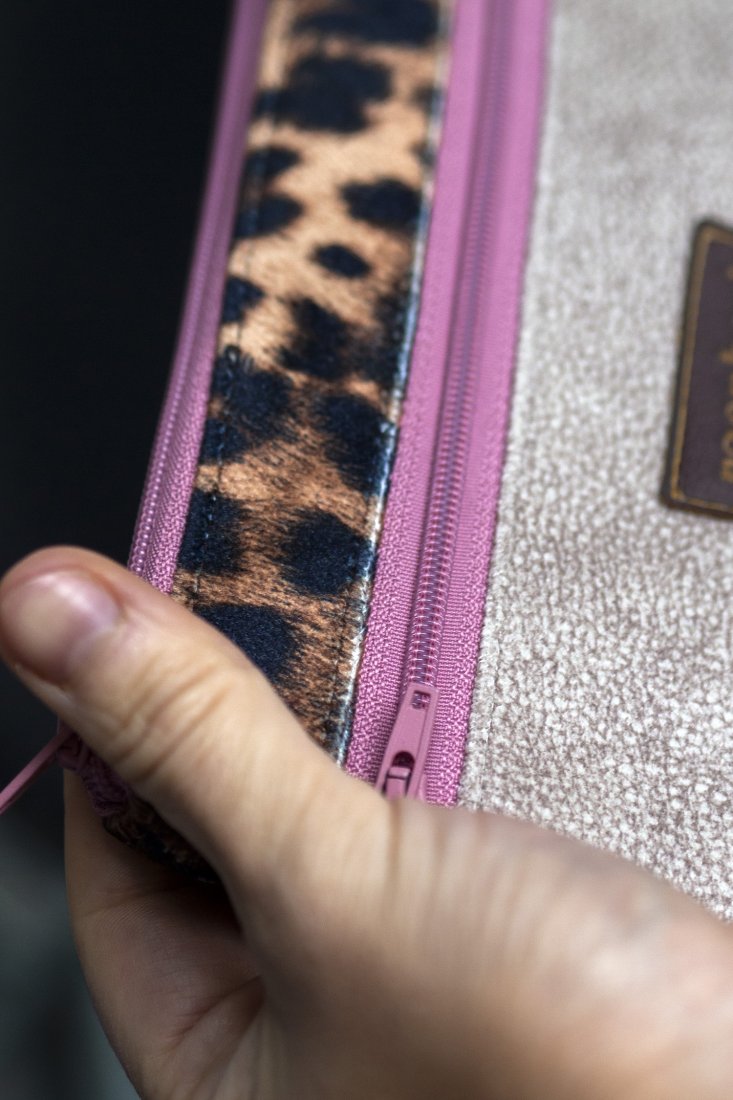 Prosty wodoodporny portfel wykonany z grubego beżowego weluru oraz weluru w panterkę.