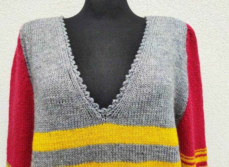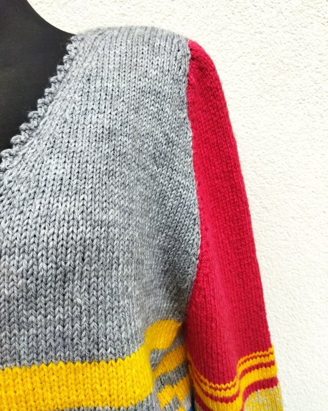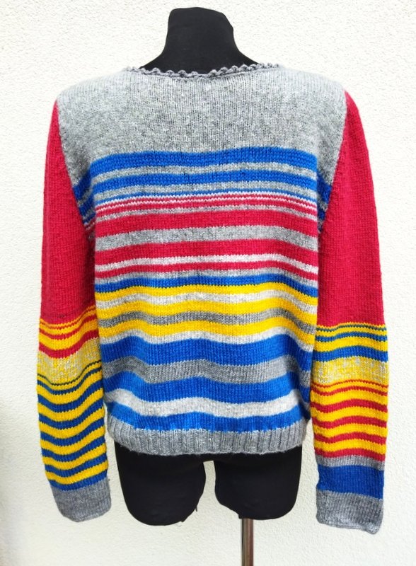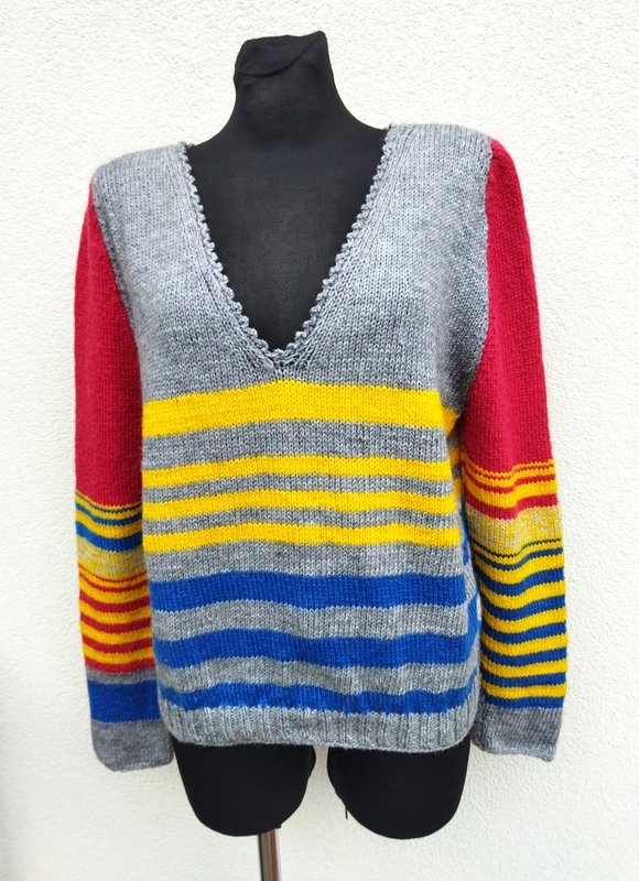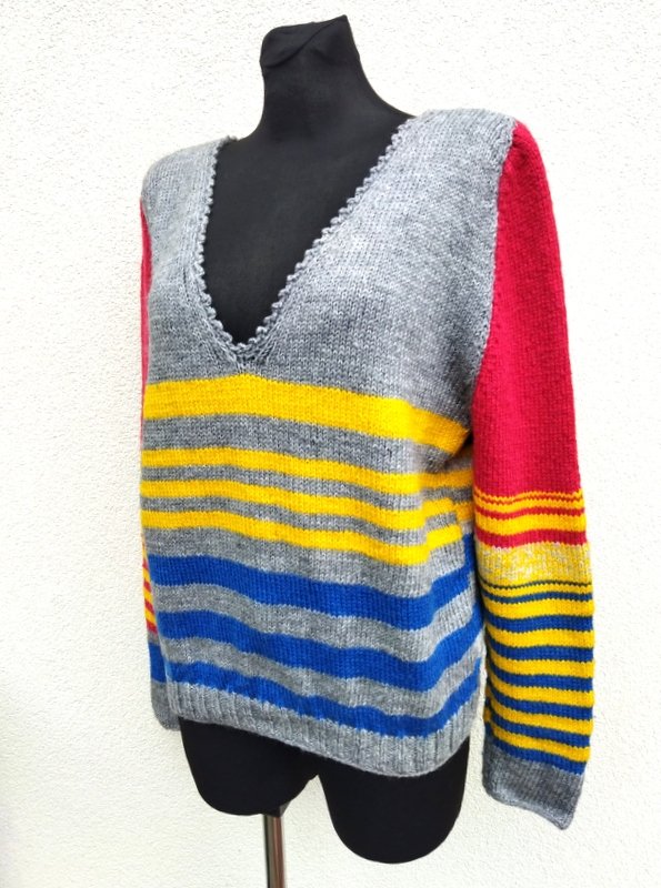 Miły miękki sweter dziergany na drutach z włóczki w kolorach szarości, żółci, czerwieni i szafiru. Dekolt w szpic obrobiony szydełkiem. Wykończony ściągaczami
