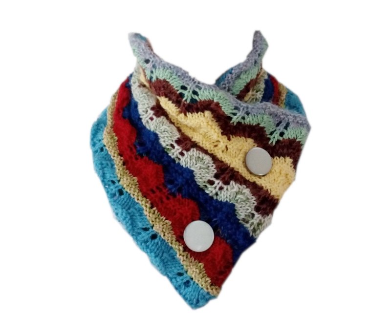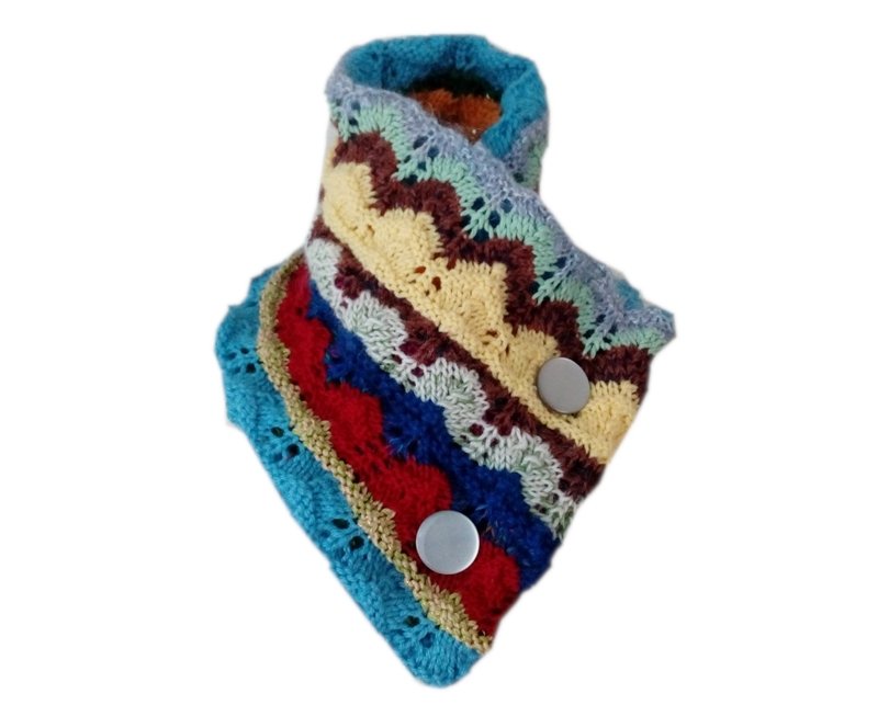 Szal wykonany jest z kolorowych włóczek, dziergany, dwuwarstwowy i bardzo ciepły.