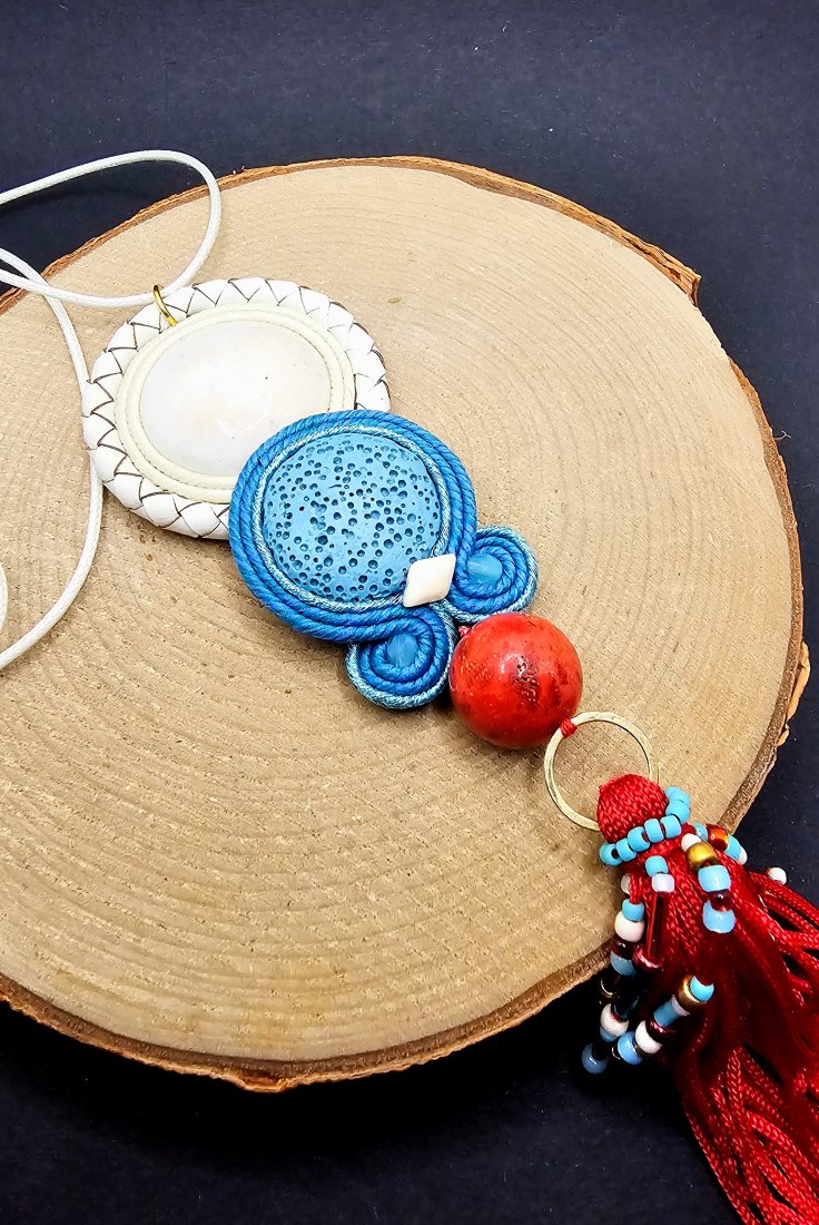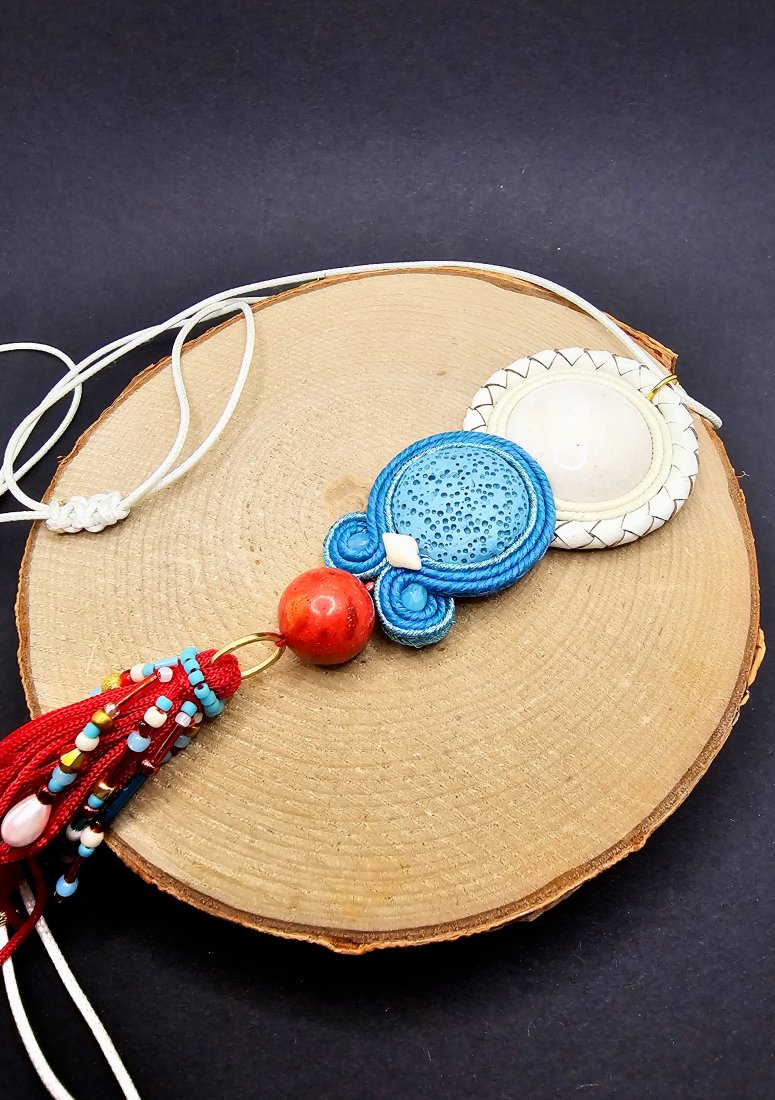 Kaboszony z kolorowej lawy wulkanicznej i ceramiki otoczone polskimi sznurkami sutasz, plecionym rzemieniem oraz szklanymi czeskimi i japońskimi koralikami o różnych kształtach i wielkościach. Dół wisiora zakończony duża kulą korala i czerwonym chwostem ozdobionym drobnymi koralikami. Wisior zawieszony na jasnym powlekanym sznurku z możliwością regulacji długości.