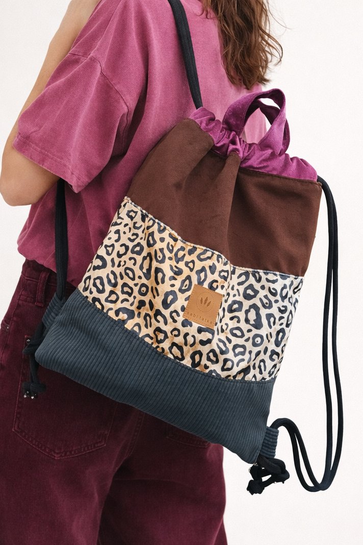 Kolorowy plecak worek z modnym motywem panterki, łączący różne faktury i odcienie.