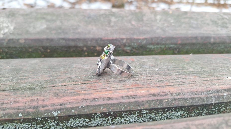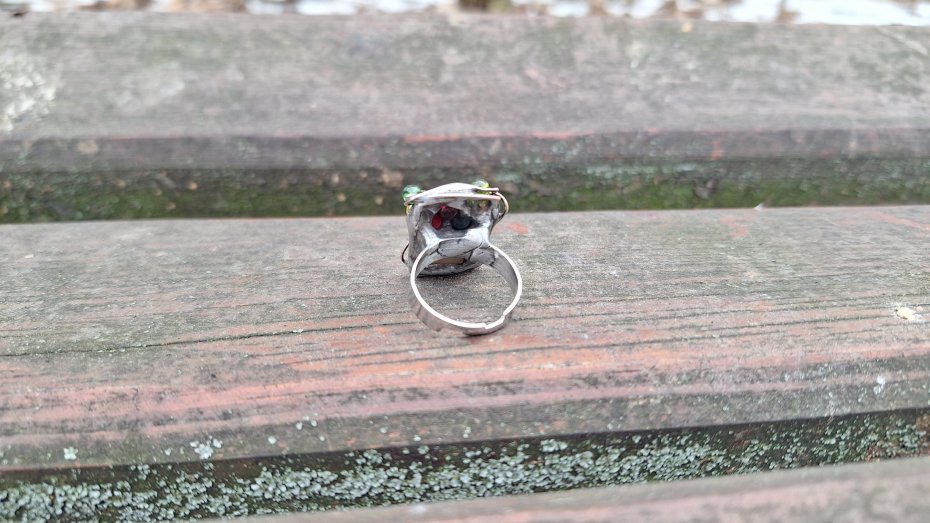 Pierścionek wykonany z miedzi, cyny, szkła i labradorytu. Wymiary ok. 2 na 1.5 cm. Regulowany. Nie jest ciężki.