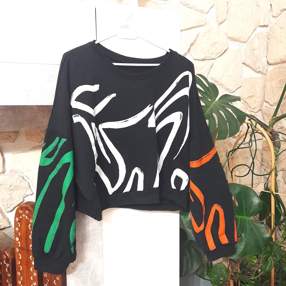 Kontrastowe maziaje: biel, butelkowy zielony i zgaszony pomarańcz.