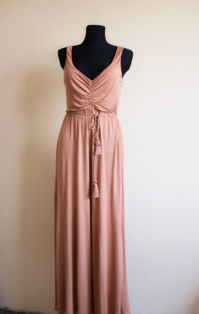 Fantastyczny kombinezon, z niskim krokiem. Materiał 100% dzianina wiskozowa.Pięknie się układa. Stan bardzo dobry. Brak metki z rozmiarem, ale powinien pasować na 40-42. W miejscu odcięcia guma i ozdobny sznurek.