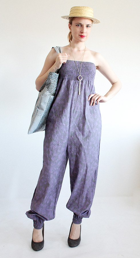 Efektowny, bawełniany kombinezon - hit sezonu. Na wysokości biustu wszyto gumki, dzięki czemu kombinezon ładnie dopasowuje się do sylwetki i utrzymuje na miejscu. Dodatkowo na boku zapięcie na suwak.