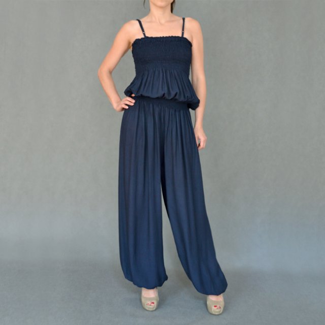 Granatowy kombinezon z lekkiej wiskozy. Biust cały na gumkach, w talii również gumka. Ramiączka regulowane, nogawki szerokie zakończone ściągaczem.