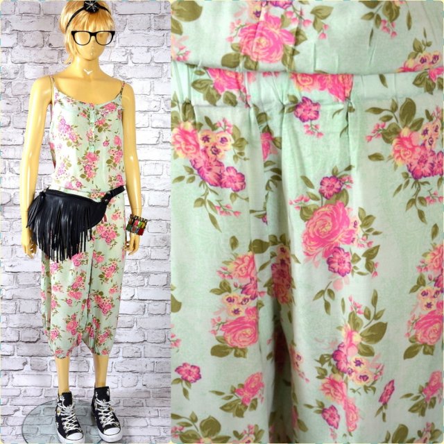 Śliczny kobiecy kombinezon w odcieniu jasnego seledynu w różowe stonowane różyczki, kombinezon na regulowanych ramiączkach , poniżej linii tali regulowany (gumka ) plus ściągany jasno różową szarfą, krok delikatnie obniżony, nogawki luźniejsze wykończone ściągaczem na gumce dzięki czemu można modelować sobie ich długość. U góry zapinany na kilka guziczków w kształcie motylków.