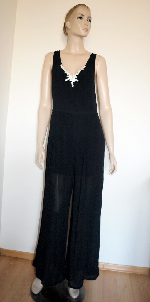 Spodnium marki warehouse z żorżetowej wiskozy. Materiał 100% wiskoza. pod spodem podszewka z krótkimi spodenkami. przy dekolcie aplikacje z białych guzików, zamek z tyłu, w pasie gumka.nogawki szerokie, z przodu mają częściowo zaszyte kontrafałdy.stan bardzo dobry. Rozmiar z metki 14, ale ja polecałabym na wysoką 38. Podaję wymiary mierzone na płasko;