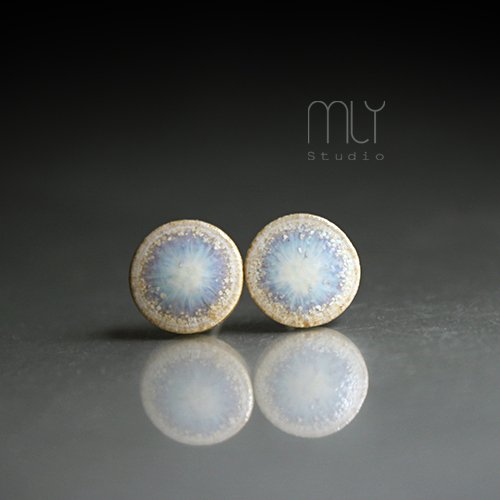Ceramiczne okrągłe kolczyki w formie sztyftów, ręcznie wykonane z delikatnej gliny kamionkowej, jednostronnie szkliwione mieszanką kremowo błękitnych szkliw z efektem plamek, na antyalergicznych sztyftach w kolorze srebrnym. Średnica ok. 9mm. Polecam .