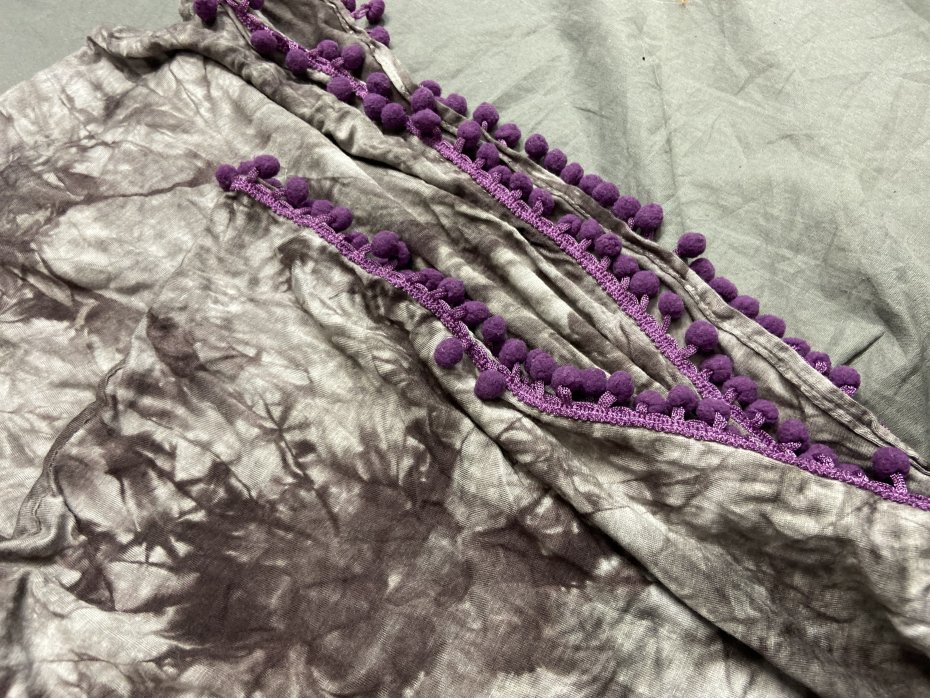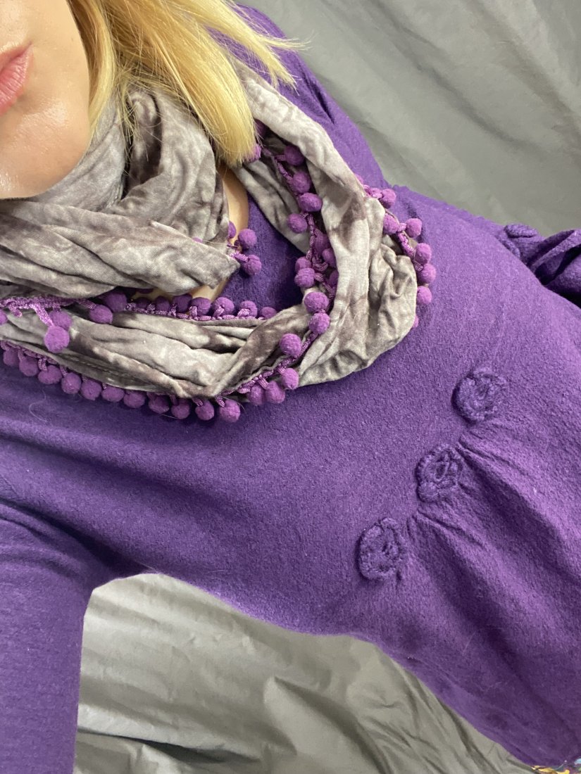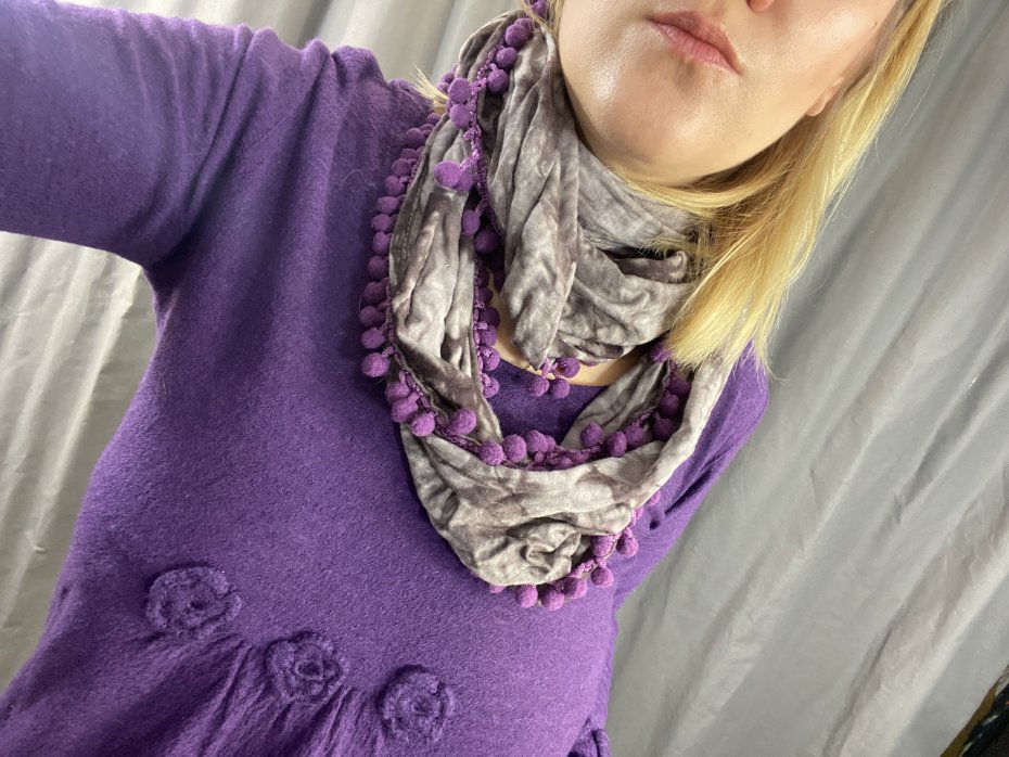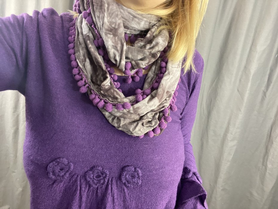 Naturalny komin (obstawiam wiskozę z elastyną). Wykończony pomponami.