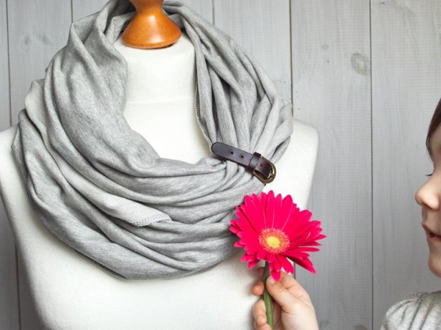 Dodatkową ozdobą jest skórzana zapinka, która daje wiele możliwości udrapowania komina/szala, ale można ją też wykorzystać jako ciekawą bransoletkę.