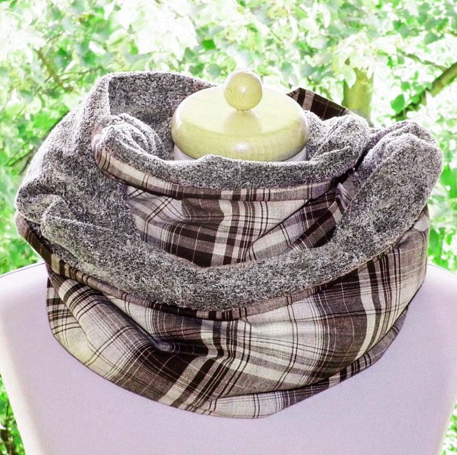 Wygodny, modny komin dwustronny, uszyty z bawełnianej tkaniny w kratkę i cieplutkiej dzianiny boucle. Dwukrotnie owija szyję. Kratka- kolory - ciepłe brązy, dzianina boucle w kolorze beżowo-szarym z perłowym połyskiem.