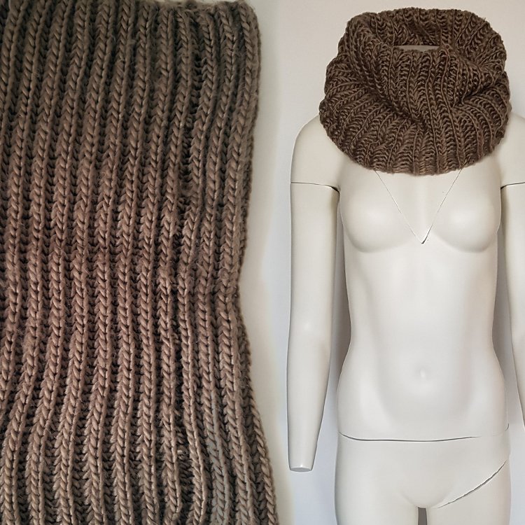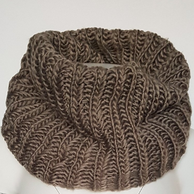 Komin z włóczki o luźnym, grubym splocie, miękki rozciągliwy. W kolorze rozbielonego, chłodnego, czekoladowego beżu.