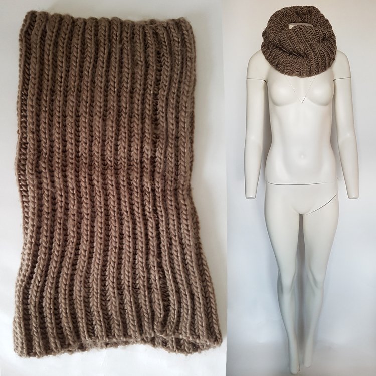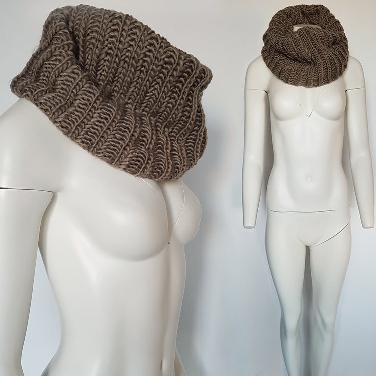 Komin z włóczki o luźnym, grubym splocie, miękki rozciągliwy. W kolorze rozbielonego, chłodnego, czekoladowego beżu.