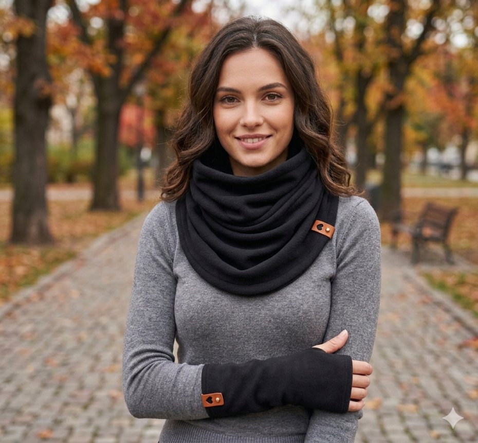 Komplet jest uszyty z dresówki drapanej pieknym kolorze czarnym o gramaturze 280. Ta miękka i przyjemna dzianina z delikatnym meszkiem od wewnątrz ogrzeje Cię w chłodne jesienne dni. Wymiary komina wysokość 60cm, obwód 140cm. Mitenki mają długość 28cm, obwód dłoni 18-19cm. Polecam.