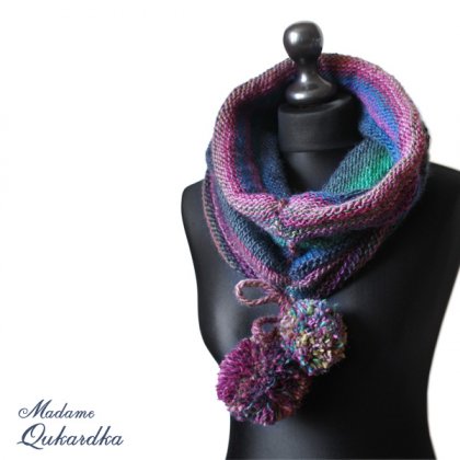 Komin - tuba , szal wraz kapturem, wielobarwny z pięknymi pomponami. Sznur z pomponami na końcu przewleczony jest przez całą długość komina i pozwala na udrapowanie komina na szyi w dowolny sposób. Kolory występujące to przewaga szaro-zielonego w kilku odcieniach, a także fiolet, róż, szmaragdowa zieleń i szafirowy błękit. Całośćwykonana ręcznie na drutach, pompony wykonane ręcznie z tej samej włóczki - jeden ciemniejszy, trochę większy, drugi mniejszy nieco jaśniejszy . Obwód komina to ca. 60 cm, długość ca 40 cm, można więc naciągnąć go na głowę - pełni wówczas funkcję ciepłego kaptura z szalem. Bardzo efektowny.