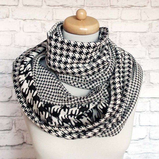 Komin z bardzo modnym motywem pepitki. Uszyty z miłej, średnio grubej, ładnie układającej się dzianiny w kolorach: bardzo jasny szary (prawie biały) i czarny.