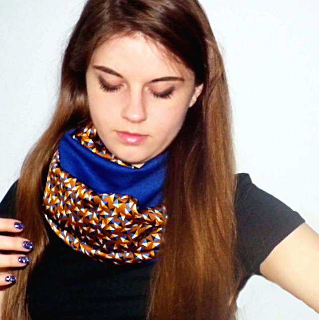 Piękny, bardzo efektowny szal, komin dwustronny uszyty z włoskiej satyny jedwabistej i dżerseju o wysokiej gramaturze z dodatkiem elastanu. Bardzo wygodny, miły dla skóry i twarzowy szal, dla każdej karnacji. Wysoka jakość wykonania, doskonałe tkaniny.