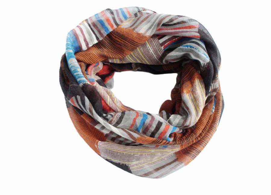 Miękki, lekki komin w ciekawe wzory, wykonany z materiału typu wiskoza (brak metki).