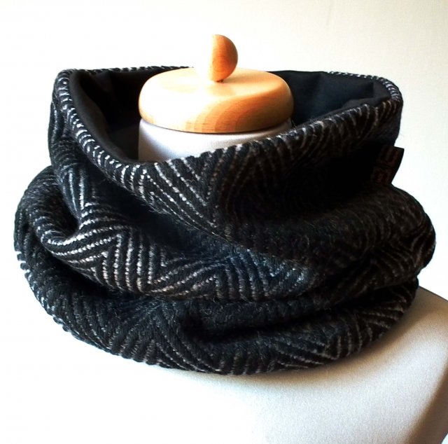 Elegancki, uniwersalny, modny, niezwykle praktyczny i ciepły dodatek. Komin (tuba, szal koło) uszyty z doskonałej tkaniny wełnianej typu jodełka w odcieniach czerni, szarości i grafitu oraz miłej dzianiny punto w kolorze czarnym.
