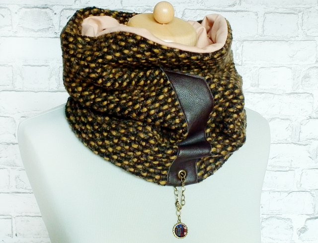 Piękny wełniany komin dwustronny. Na zewnątrz tkanina wełniana w odcieniach brązu, wewnątrz przyjemny dla skóry, gruby, doskonały jakościowo jersey. Dodatkową ozdobę stanowi naszyta eko-skórka, nit i wyjmowana zawieszka z grafiką artystyczną za szkłem, w oprawie w kolorze antycznego brązu. Wyjątkowy i niepowtarzalny.