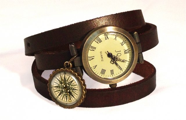 Zegarek ze skórzanym paskiem kilkakrotnie zakręcanym na ręku z ręcznie robioną zawieszką (kaboszonem).