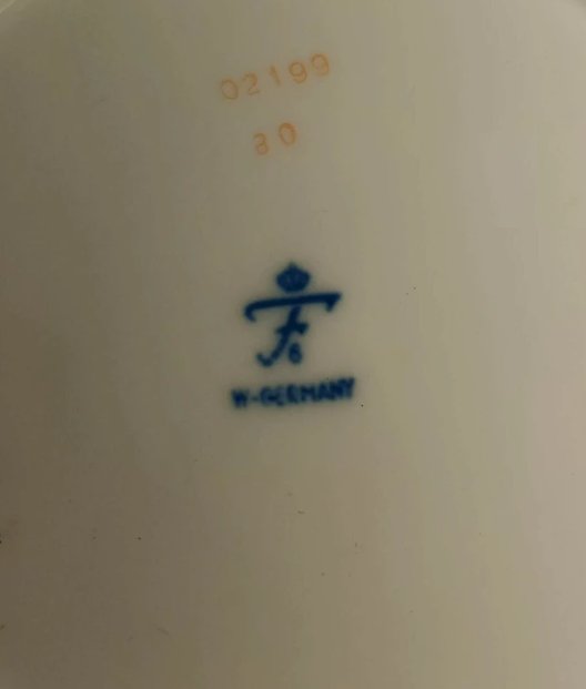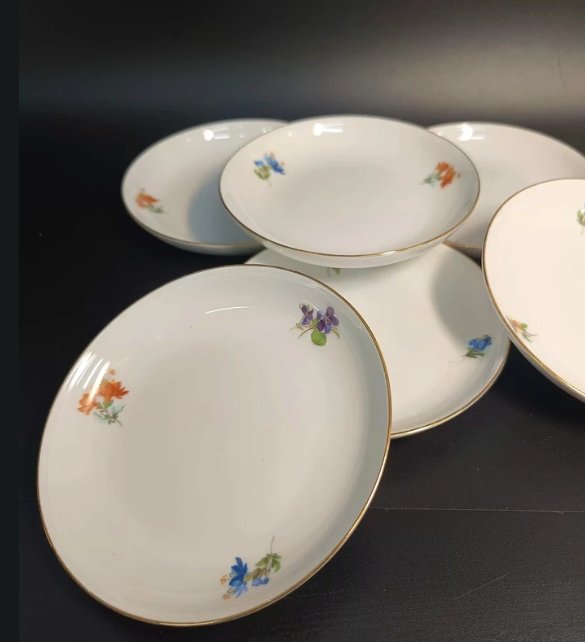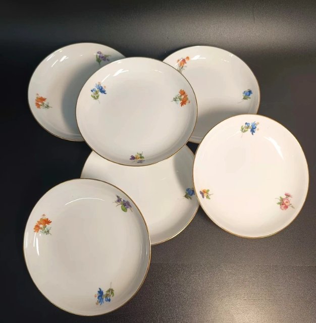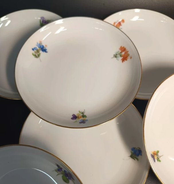 Komplet 6 ślicznych talerzyków z motywem kwiatowym i złoceniami. Sygnowane Furstenberg.