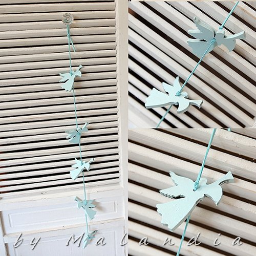 Uskrzydlona zawieszka. Sznur 5 błękitnych aniołów z drewna, ręcznie malowanych, zawieszonych na niebieskim rzemyku. Mogą trzepotać delikatnie nad głową, przycupnąć w kąciku, zawisnąć nad łóżkiem.