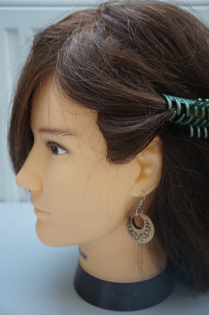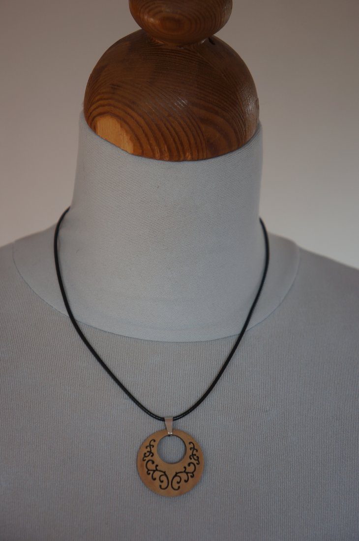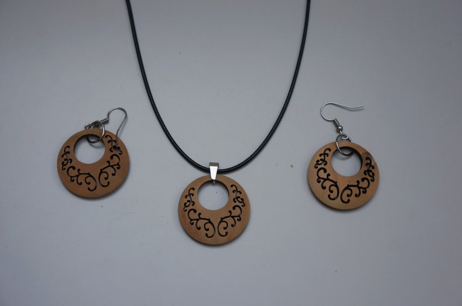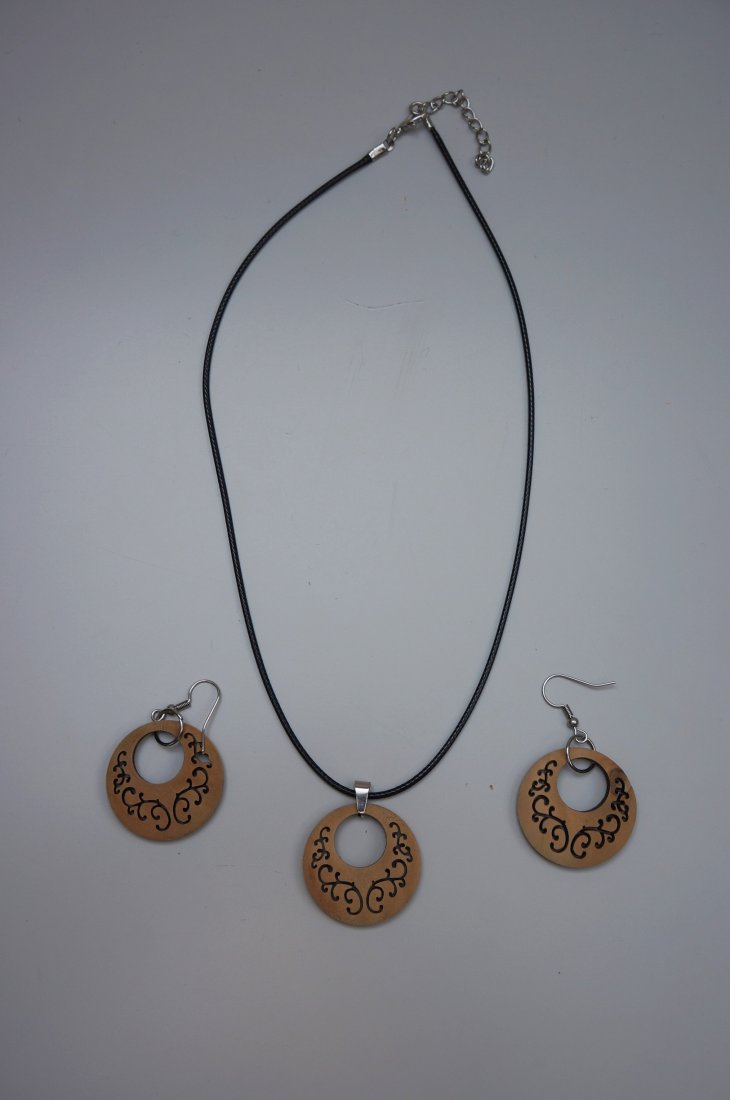 Drewniany zestaw biżuterii - naszyjnik i kolczyki. Wisiorek zawieszony na bawełnianym, woskowanym sznurku. Wisiorek i kolczyki zdobione ażurowymi wycięciami. Kolczyki na otwarty bigiel. Stan bardzo dobry.