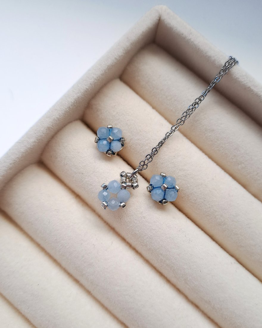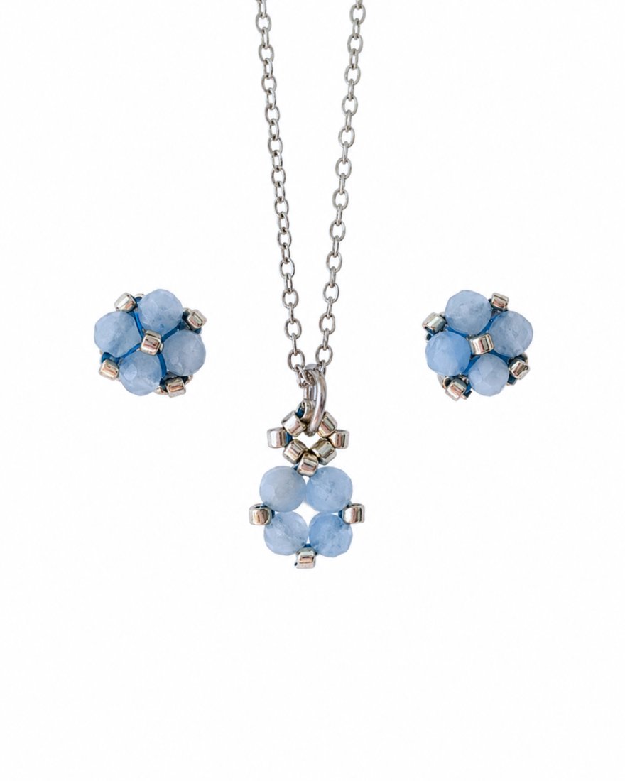 Delikatny komplet z akwamarynu to połączenie minimalistycznych sztyftów i pasującego naszyjnika, które razem tworzą spójną, harmonijną całość. Subtelny odcień błękitu oraz srebrne detale nadają biżuterii świeży, spokojny charakter. To zestaw, który doskonale sprawdzi się zarówno na co dzień, jak i jako elegancki, nienachalny akcent do bardziej wyjątkowych stylizacji.