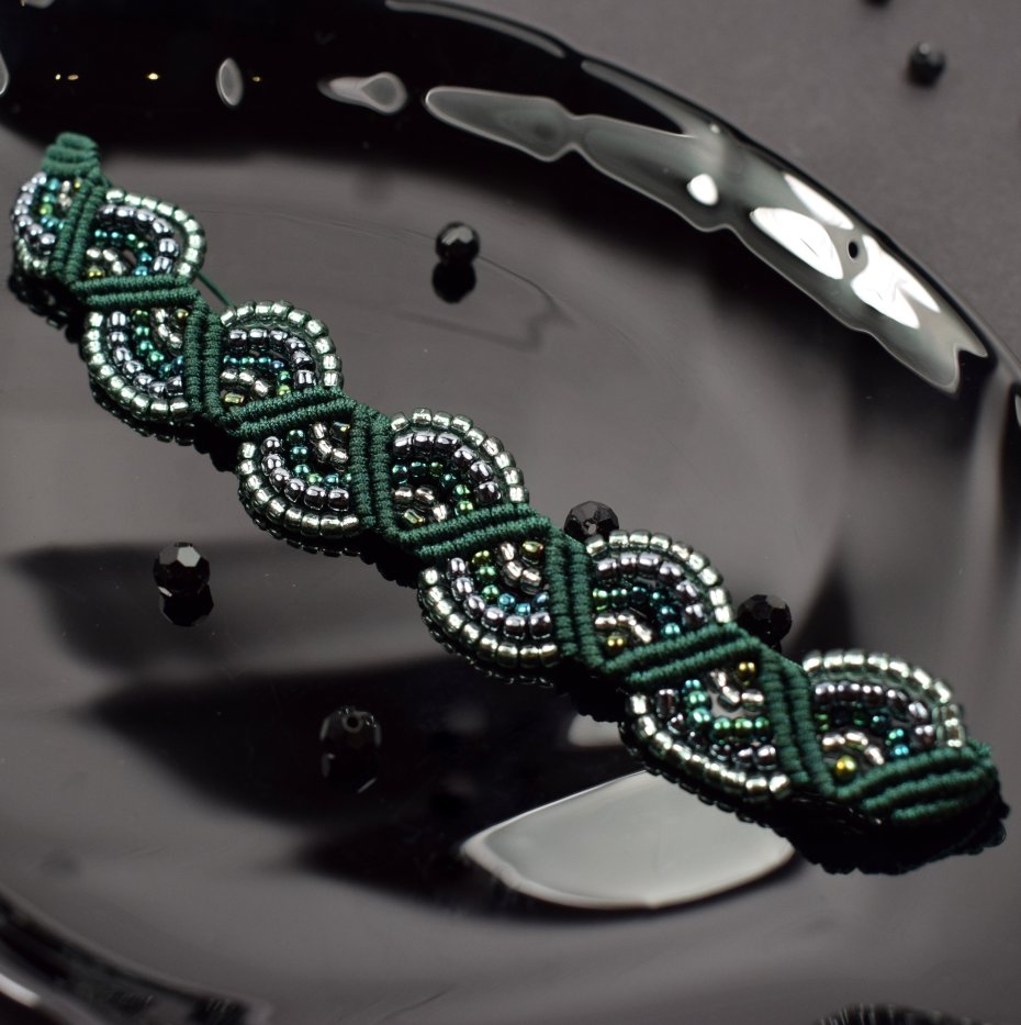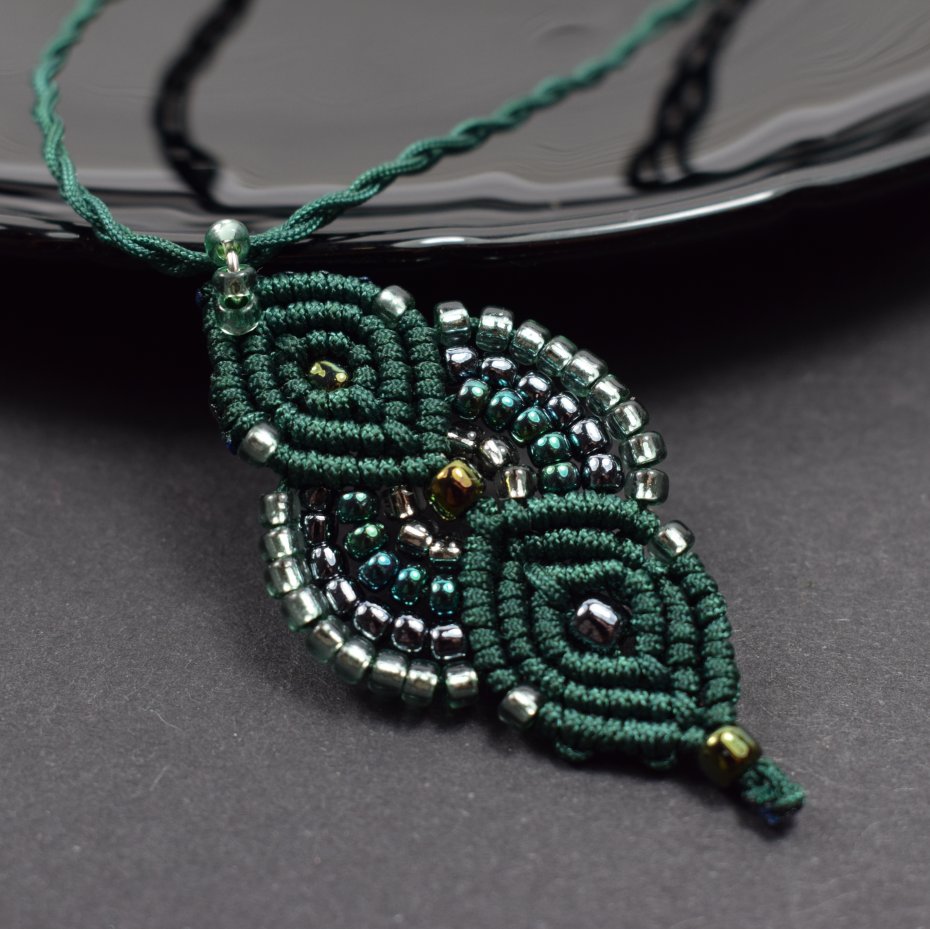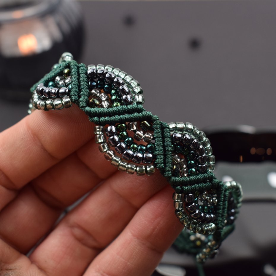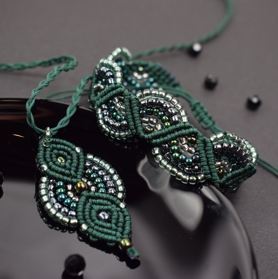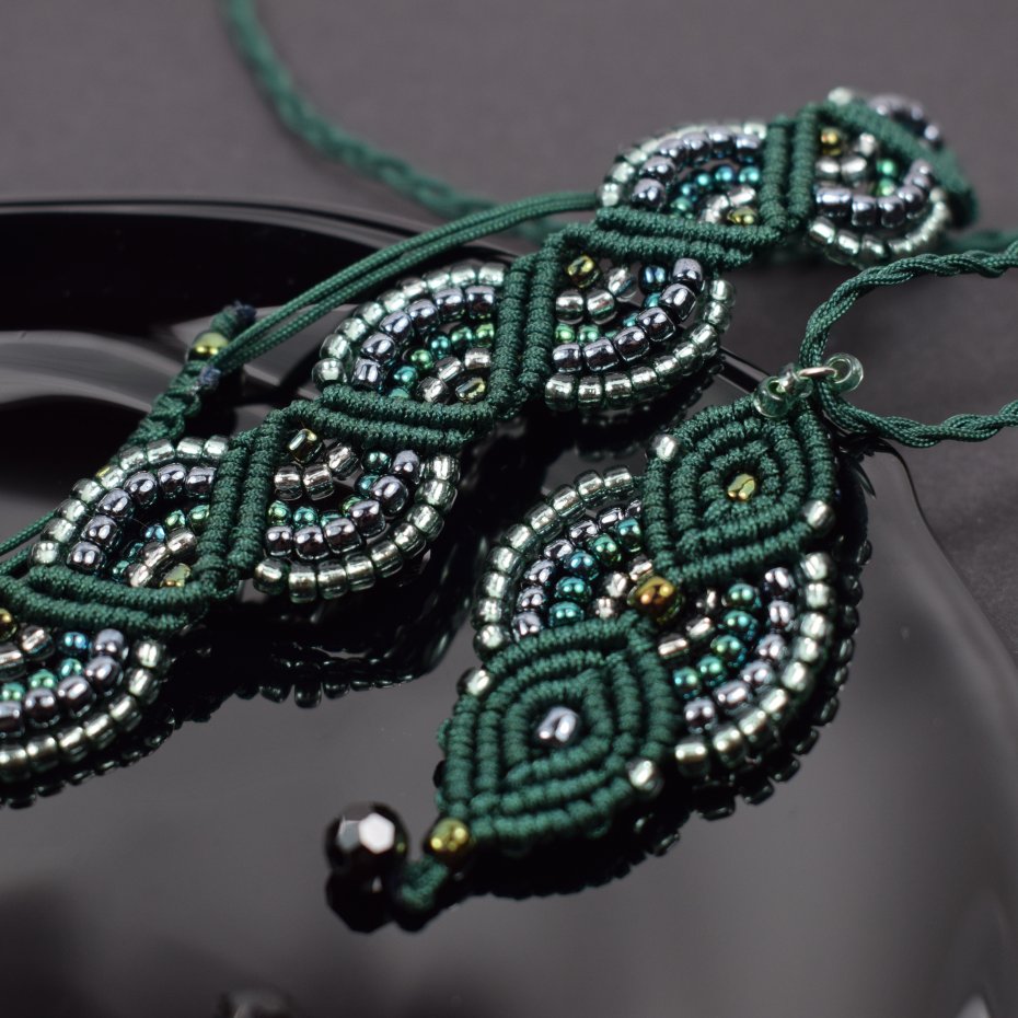 Ręcznie wykonany komplet biżuterii - naszyjnik i bransoletka - stworzony techniką makramy z profesjonalnego sznurka w kolorze głębokiej butelkowej zieleni. Każdy element został misternie wypleciony i ozdobiony drobnymi, lśniącymi koralikami w odcieniach srebra, szmaragdu i grafitu.