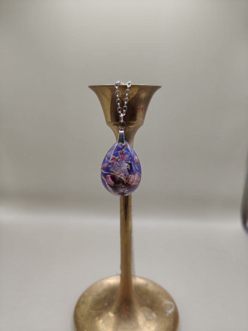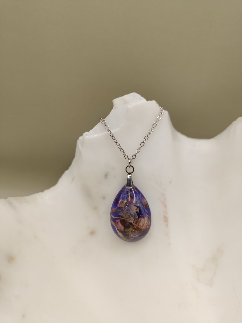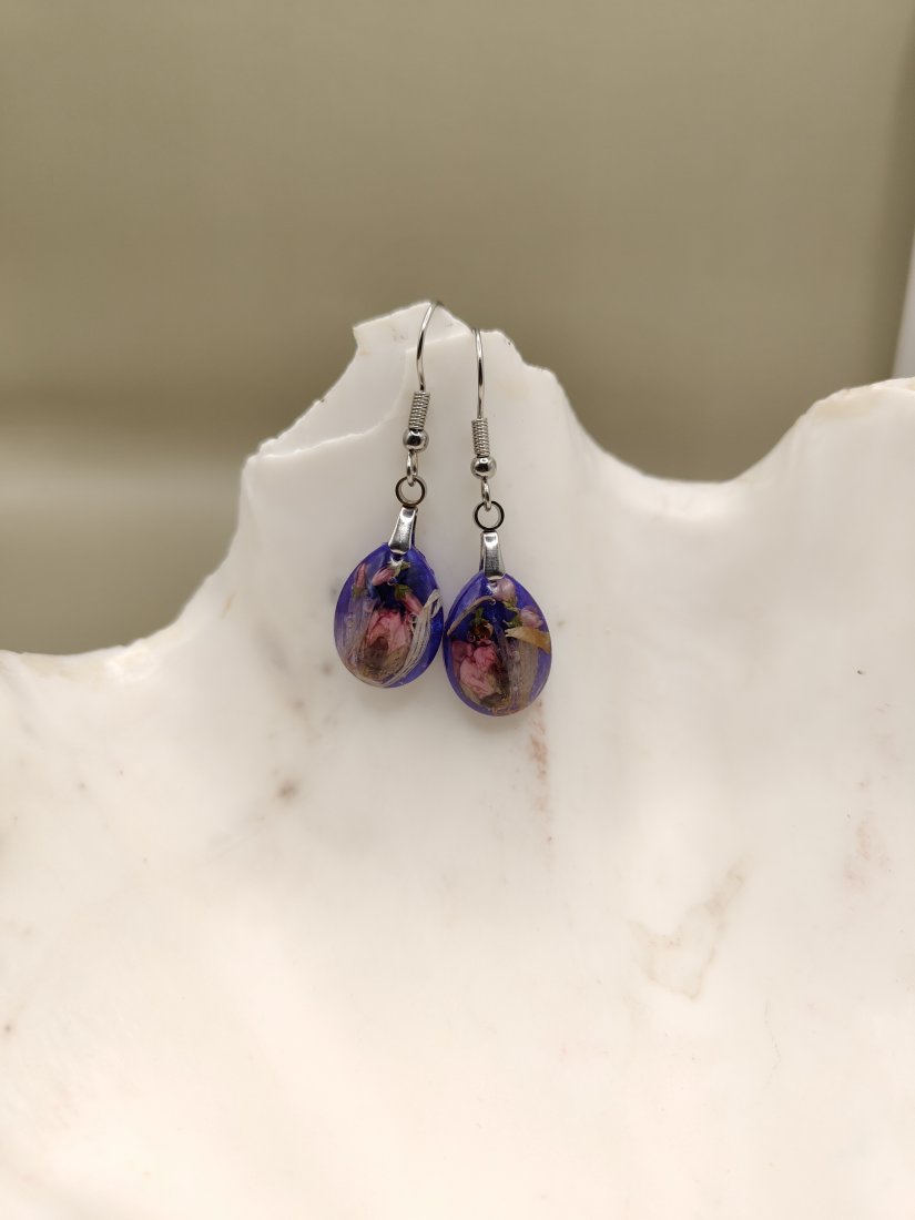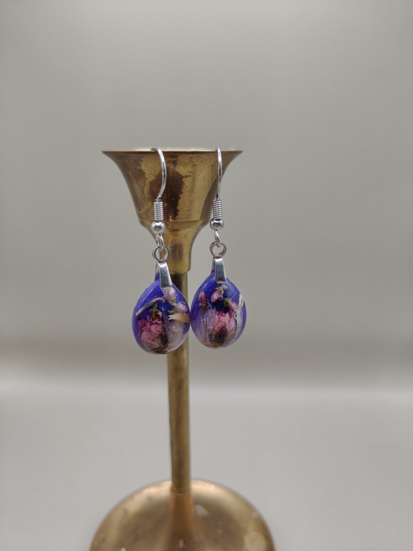 Kolor intensywnego fioletu nadaje biżuterii energii, elegancji i oryginalności, a zatopione kwiaty dodają subtelności i finezji. To idealny wybór dla kobiety, która ceni dodatki jedyne w swoim rodzaju — naturalne, artystyczne i wykonane z sercem. Komplet sprawdzi się zarówno do codziennych stylizacji, jak i na wyjątkowe okazje.