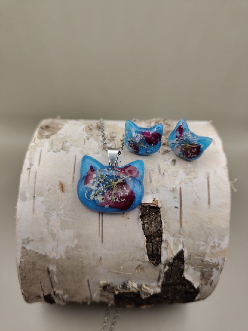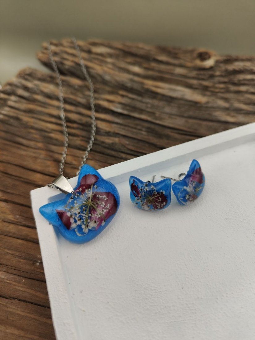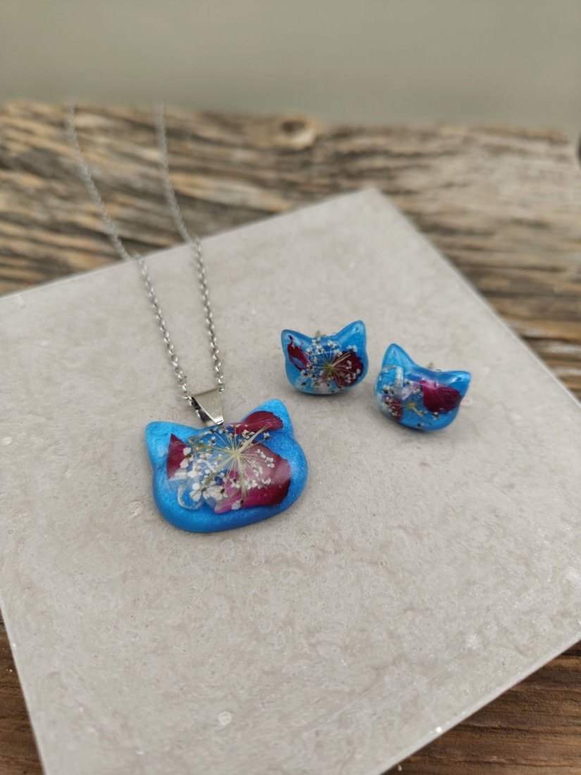 Wyjątkowy komplet biżuterii inspirowany kocim motywem, wykonany z transparentnej żywicy w intensywnym odcieniu błękitu. Wewnątrz zatopione są naturalne, suszone kwiaty, które nadają całości artystycznego i niepowtarzalnego charakteru. Komplet przyciąga wzrok, łącząc delikatność natury z oryginalną formą – idealny dla miłośniczek kotów i biżuterii handmade.