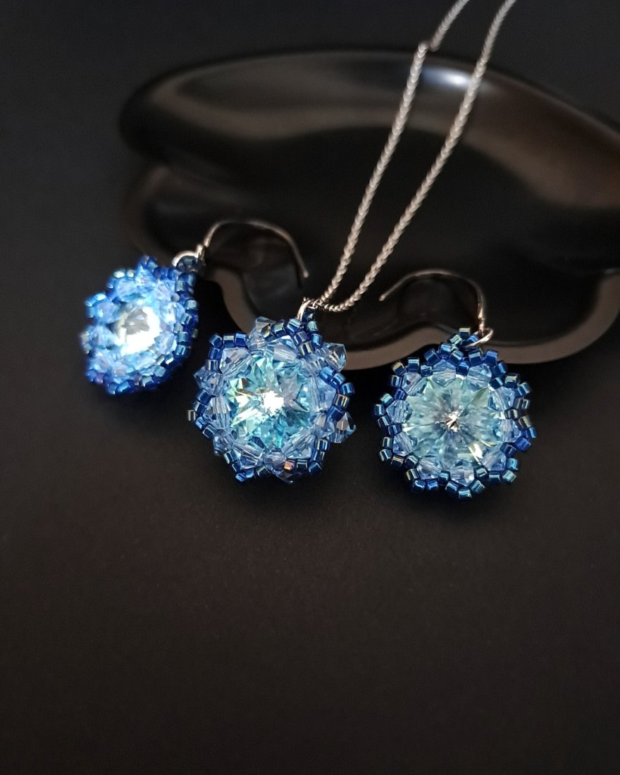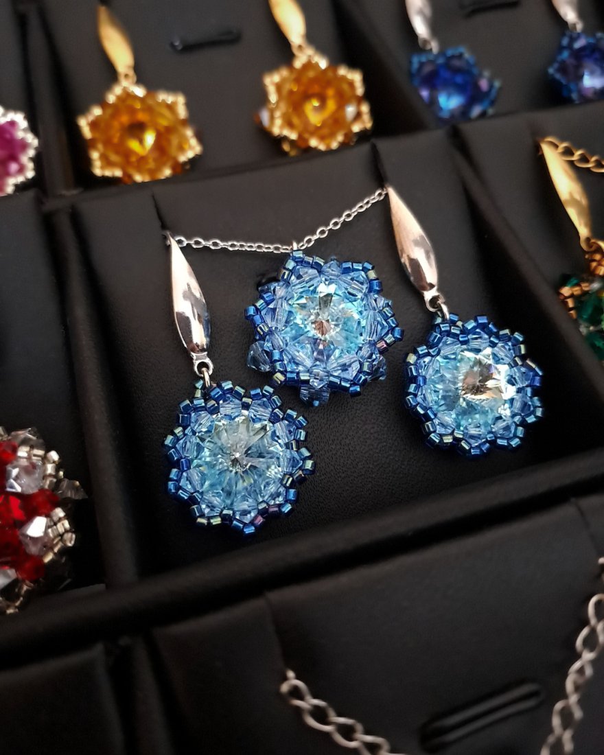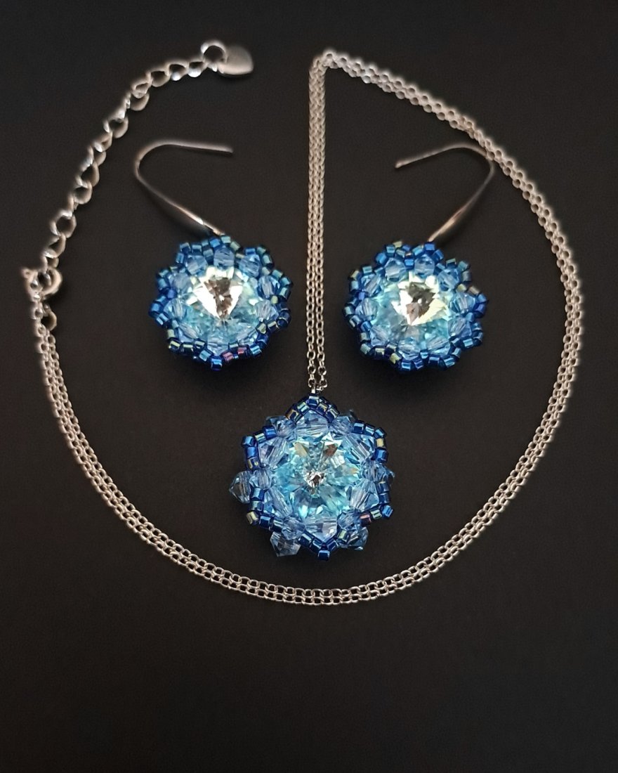 Każdy element tego zestawu został stworzony z dbałością o najmniejszy szczegół - ręcznie, z miłością i precyzją. Centralne kamienie Preciosa Rivoli Maxima 12mm, oplecione są lśniącymi kryształkami Preciosa Bicone i koralikami Miyuki, które tworzą hipnotyzującą kompozycję. Naszyjnik zawieszony jest na delikatnym łańcuszku ze stali nierdzewnej (45 cm 5 cm przedłużki), kolczyki zakończone są wygodnymi biglami - całość jest lekka, elegancka i niezwykle kobieca.