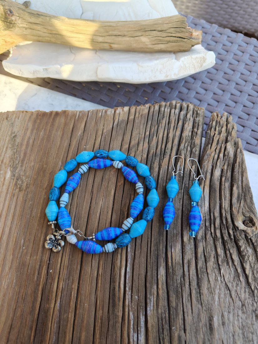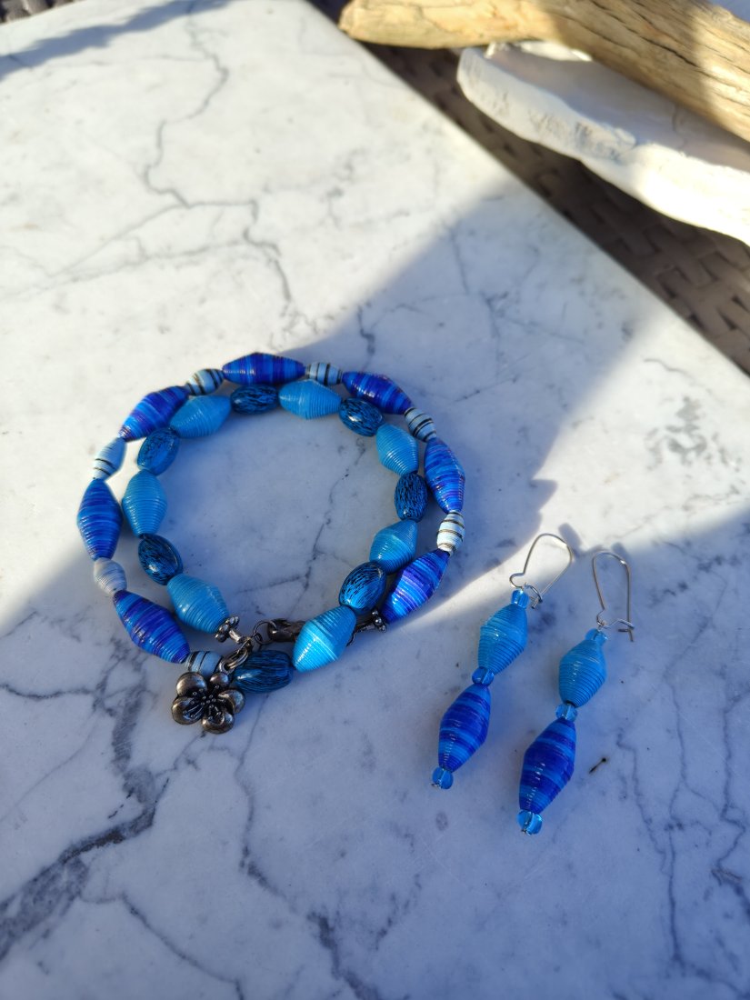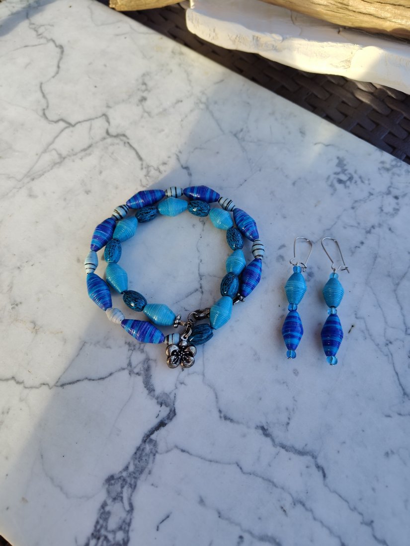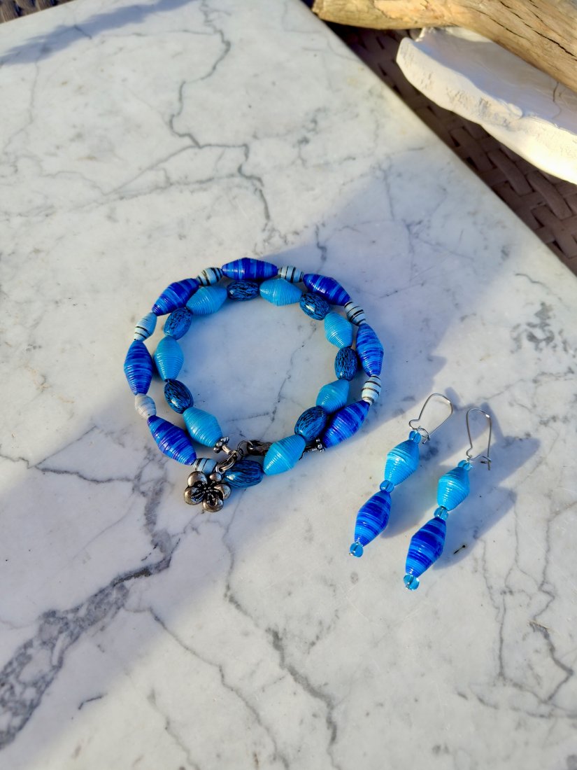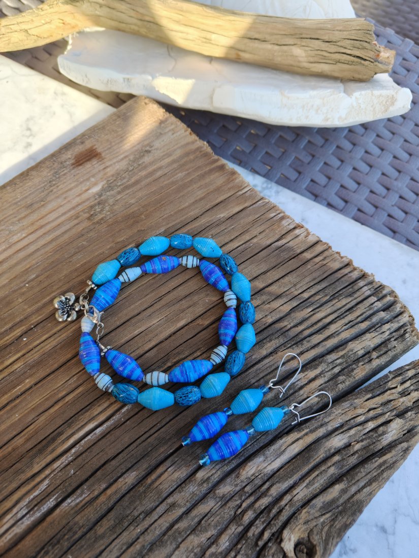Komplet "Oceaniczna Harmonia" to wyjątkowe połączenie głębokich odcieni błękitu i turkusu, inspirowane kolorem morza i letnią swobodą. Ręcznie wykonane koraliki o różnorodnych fakturach tworzą dynamiczną, a zarazem elegancką kompozycję. Bransoletka z ozdobnym zapięciem oraz lekkie, wiszące kolczyki pięknie dopełnią zarówno codzienne stylizacje, jak i letnie, wakacyjne kreacje. To biżuteria, która przyciąga wzrok i podkreśla indywidualny charakter.