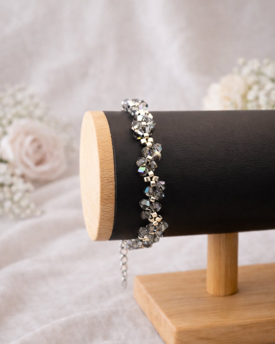 - Bransoletka: splot drobnych kryształków Preciosa Black Diamond 3 mm i srebrnych Miyuki Delica, szer. 0,7 cm.