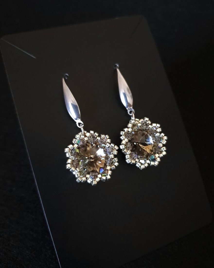 - Kolczyki: centralny kryształ Preciosa Rivoli Maxima 12 mm w odcieniu Black Diamond, otoczony kryształkami Preciosa Bicone i srebrnymi koralikami Miyuki. Długość ok 4 cm.