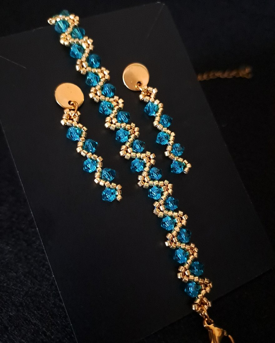 Bransoletka i kolczyki zostały wykonana ręcznie z kryształków Preciosa Bicone (4 mm) w odcieniu Blue Zircon - głębokim, lekko turkusowym błękicie o delikatnym połysku.