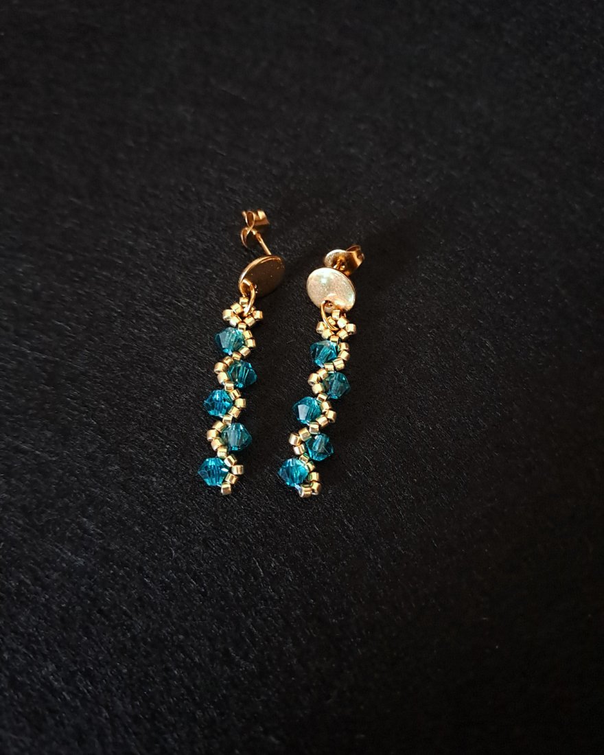 Chłodny turkus kryształków kontrastuje tu z ciepłym światłem złotych detali, tworząc kompozycję, która przypomina słońce odbijające się od powierzchni morza. To biżuteria inspirowana naturą - i jej spokojną, wyważoną elegancją.