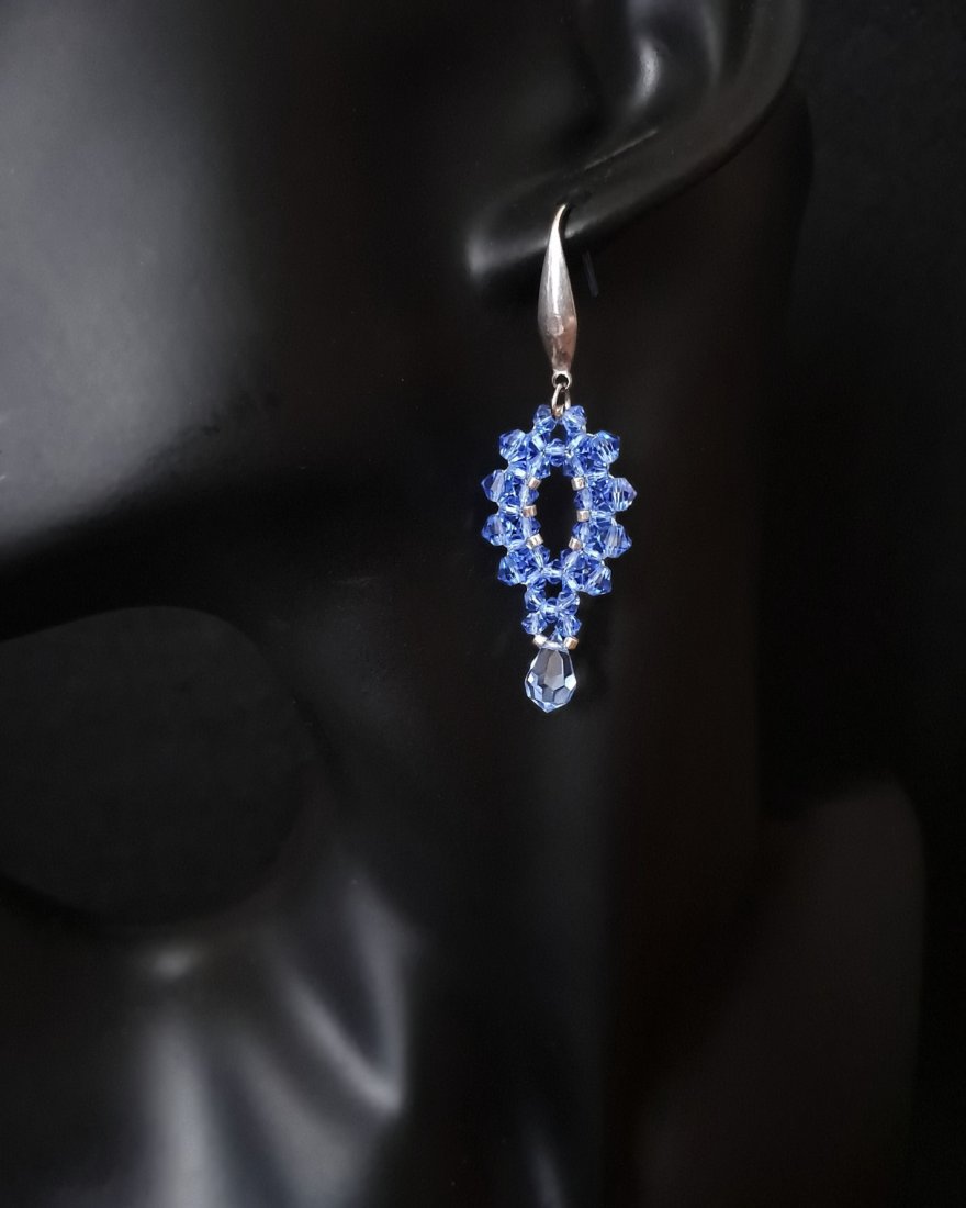 W kolczykach błękitne kryształki tworzą ramę, srebrne akcenty rozjaśniają kompozycję, a fasetowana kropla domyka ją z wdziękiem.