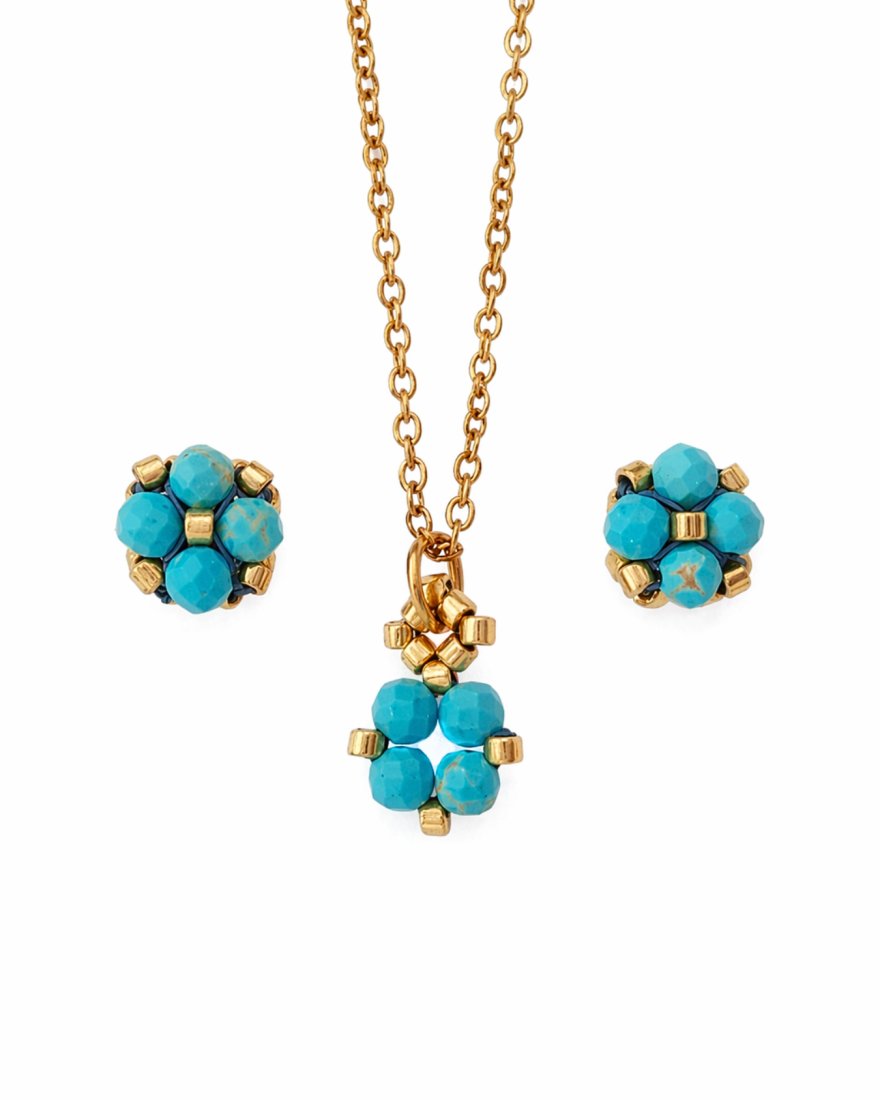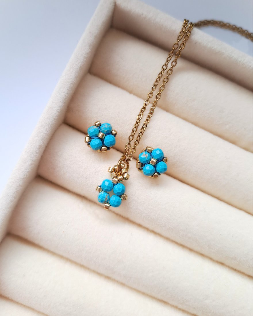 Delikatny komplet z turkusu to połączenie minimalistycznych sztyftów i pasującego naszyjnika, które zachwycają intensywnym, morskim odcieniem przełamanym naturalnym rysunkiem kamienia. Złota oprawa z koralików Miyuki dodaje im ciepła i elegancji, pięknie podkreślając nasyconą barwę turkusu. To połączenie tworzy wyrazistą, a jednocześnie harmonijną kompozycję, która rozświetla twarz i dodaje stylizacji świeżości.