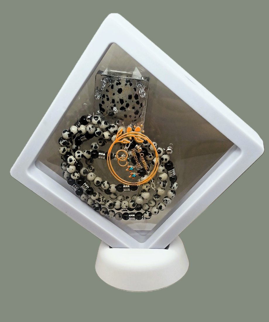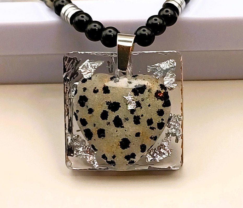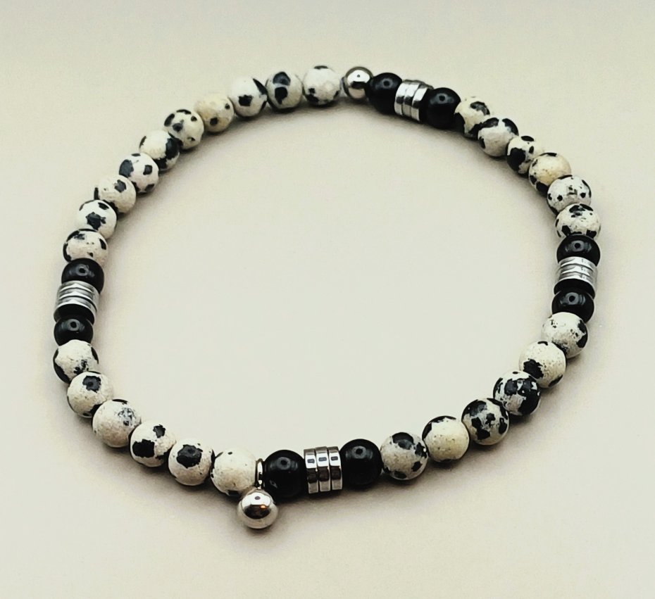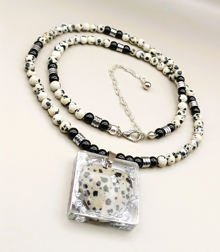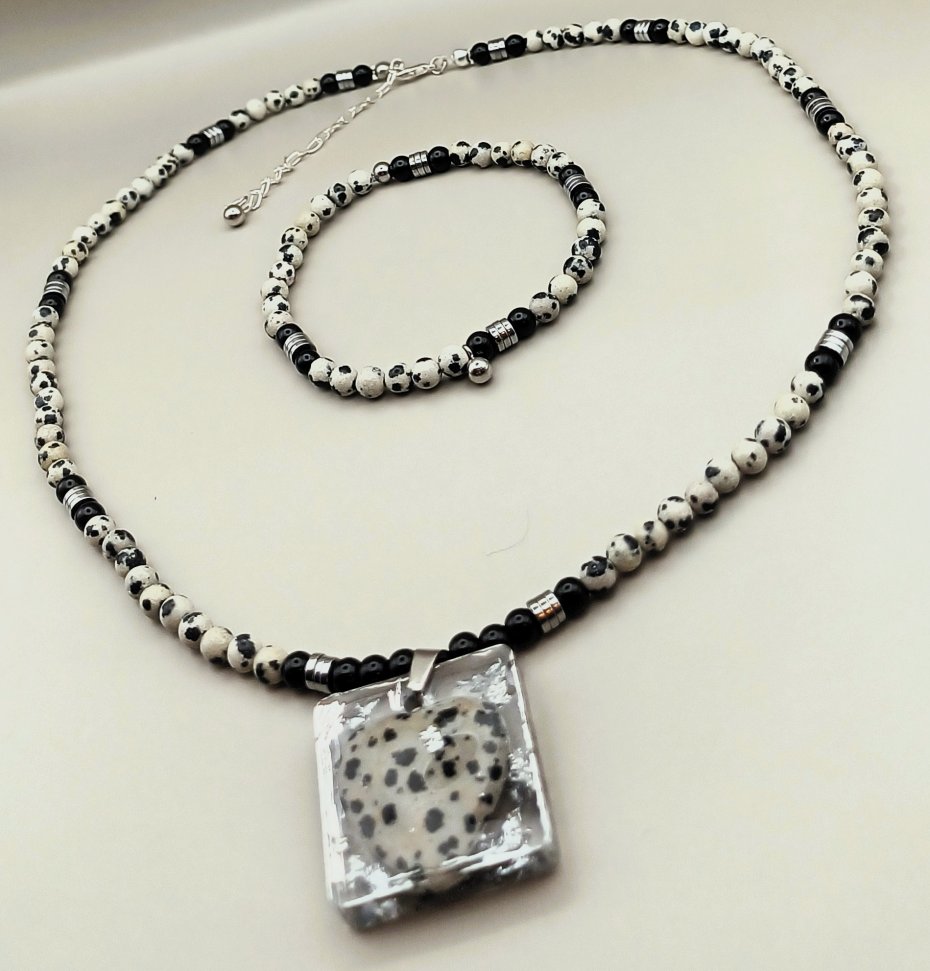 Komplet ręcznie robiony z naturalnych kamieni jaspisu dalmatyńskiego i obsydianu czarnego.