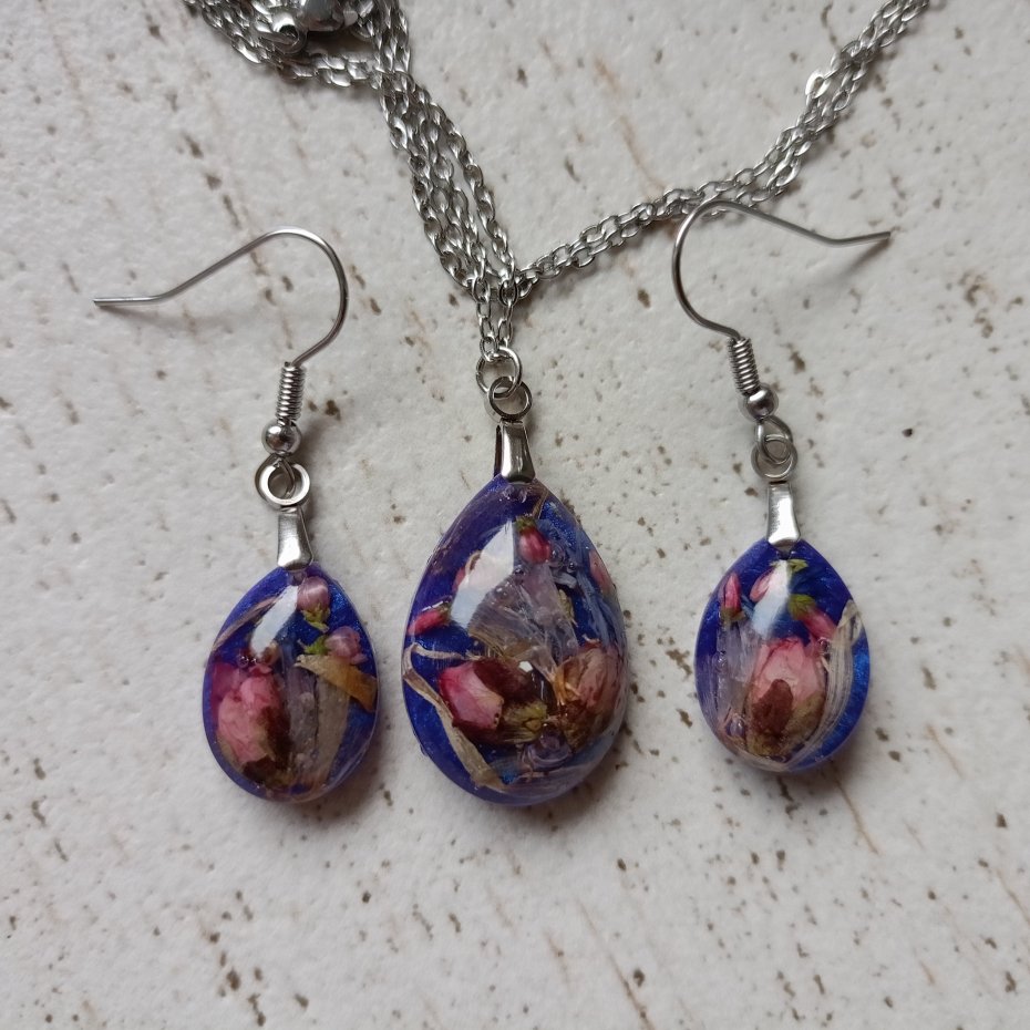 Komplet biżuterii z suszonymi kwiatami – wisiorek i kolczyki